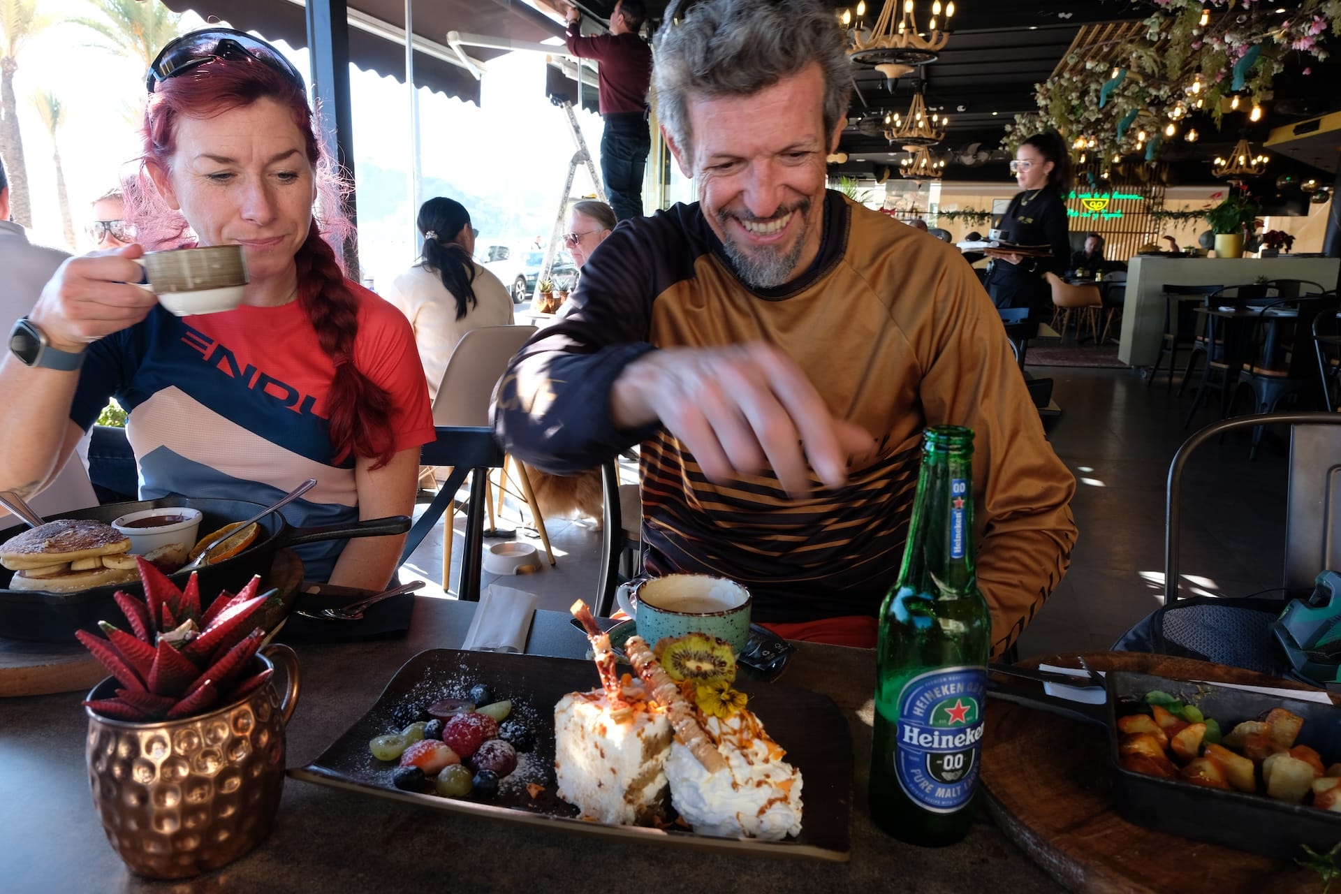 Our next trail is a Costa Brava mix of loose rock and slippery off-camber slopes. We chase each other, swapping places as a rider bobbles on a rock step-up, or slides out on a corner. We don’t really notice as our trails start getting more and more overlooked by whitewashed houses and our trails get more limited in scope. Before we’re really aware, our tyres are back on tarmac and we close in on the finish of the ride.