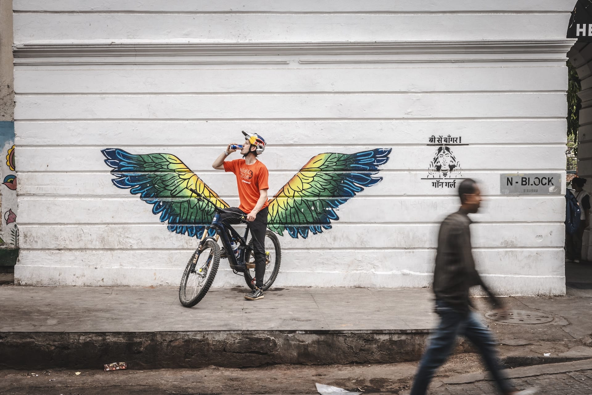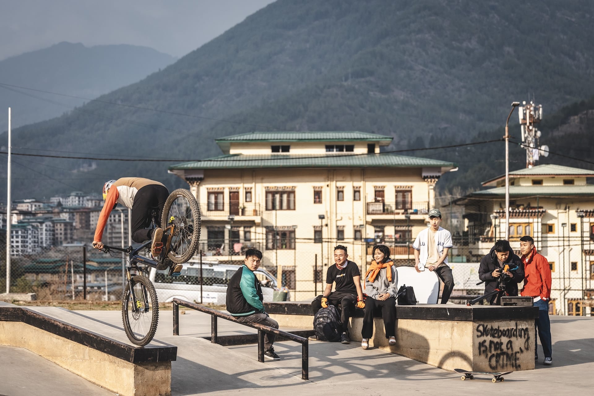 “From here, it’s all downhill, enjoy!” Tandin calls out and pedals off. Tom struggles to keep the rear wheel of the rider in front in sight on the dusty paths, as the local champion knows every inch of the trail. The path is lined with prayer flags fluttering rapidly in the wind. Through a corridor of white, blue, red and yellow flags, the two race into the valley. Suddenly, we round a corner and stand before a temple. A scene like out of a video game – it all looks so unreal. I snap a few photos, but we barely have a moment to catch a breath and move on quickly – there’s not much time before sunset. Before we reach our destination, the urban skatepark, we pass one of the largest sitting Buddha statues in the world, towering over the city and protecting it. Wow, what an introduction to Tandin’s biking world! And for Tom, a good preview of what Bhutan has to offer.