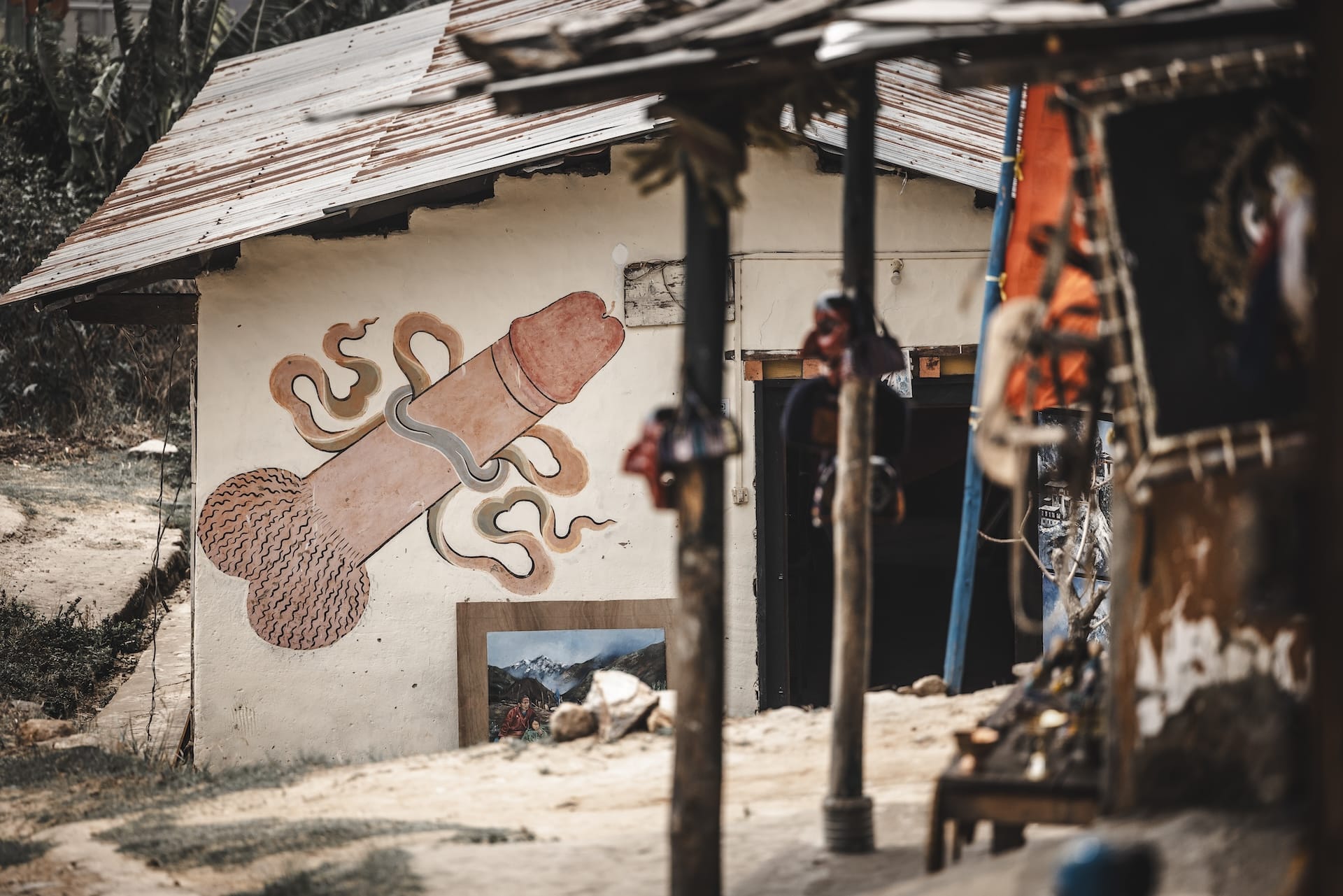 We cross the main road several times and reach a small village. Suddenly, there’s more activity. Minibuses with Indian tourists line up in a parking lot. A group of giggling Asian women pose in front of a house, taking photos. Tandin says it’s time to tell us the story of the Madman. Legend has it that 500 years ago a holy monk defeated a demon with his best part. Since then, phallic symbols have been painted on buildings or carved and hung at entrances to ward off evil spirits. It’s now known that penises not only drive away demons but also attract tourists.