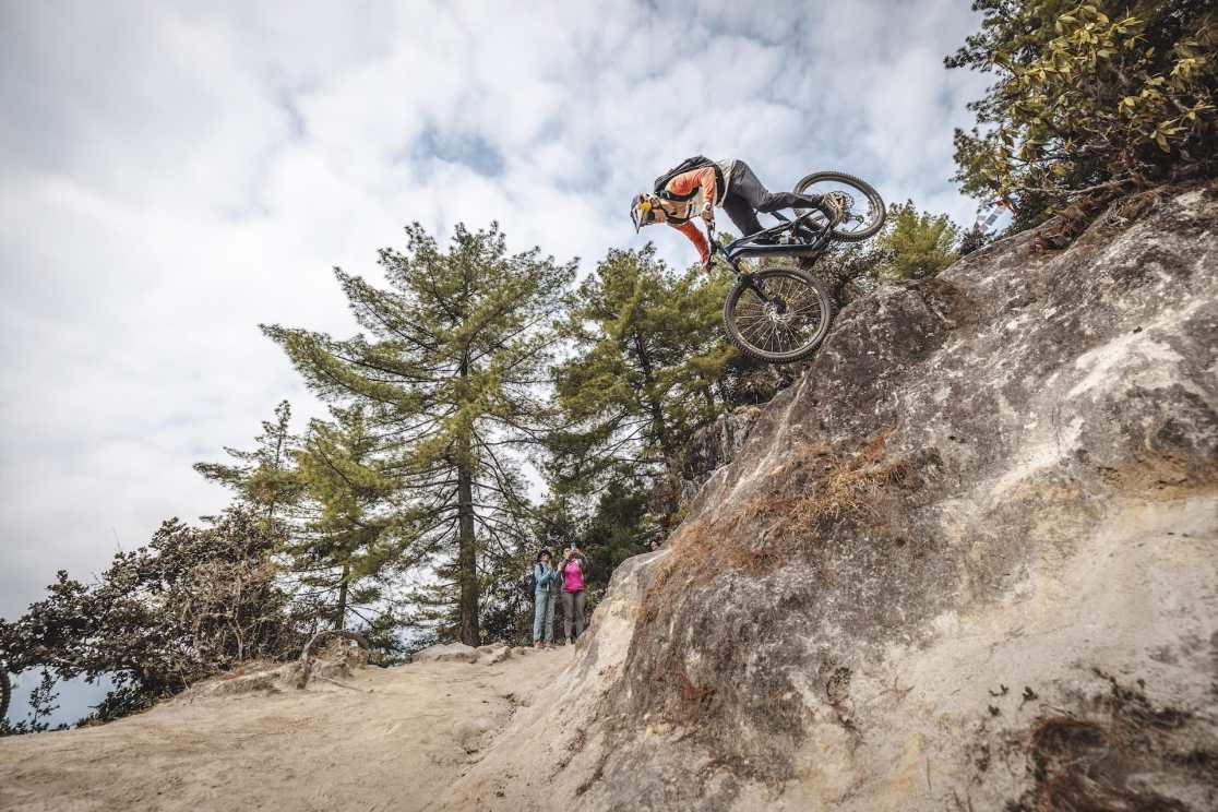 In Punakha Valley, culture is first on the agenda. Tandin swaps his bike clothes for traditional attire, as he won’t be admitted to the impressive monastery fortress without it. We witness a ceremony with monks, drums, and trumpets, and Tom receives a quick course in Buddhist history and religion from Tandin. Mentally strengthened, we are now ready for the Prince’s enduro trail.