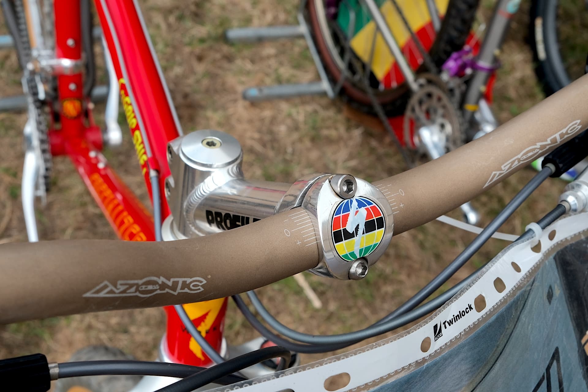 Bullseye wheels, which are rather old and lovely. XT Thummies, I’ve always been a fan of Thumbshifters. Onza bar ends, Onza is just so cool. I had stickers as a teenager and I couldn’t really afford any of the actual Onza bits. So now I’ve got quite a few of the Onza bar ends, it’s quite nice. And this has got Top Line cranks, which are a bit before my time, I’m told they’re pretty rare, but they’re so lovely. So much of this stuff from back in the 90s was just CNC’d and shiny and lovely and it’s quite different to modern bikes.