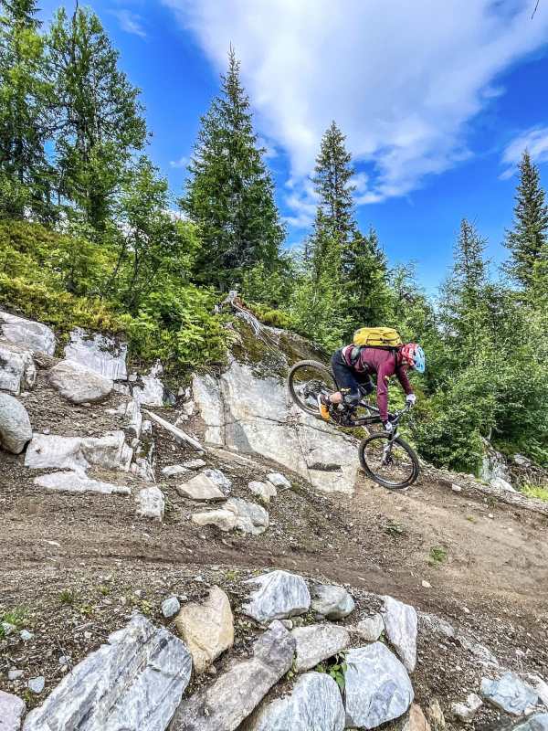 Named after the wild berries that grow prolifically here, the flow is endless, except when it’s not because of the tumble of yet-to-be-placed boulders beside the waterfall that Glen promises will be a ‘blue’ trail when finished. Right now, we struggle to clamber over these massive rocks at the construction site, struggling with our bikes – what Glen describes seems unimaginable. But having said that, we have seen what World Trail has achieved in other places, so we don’t doubt him.