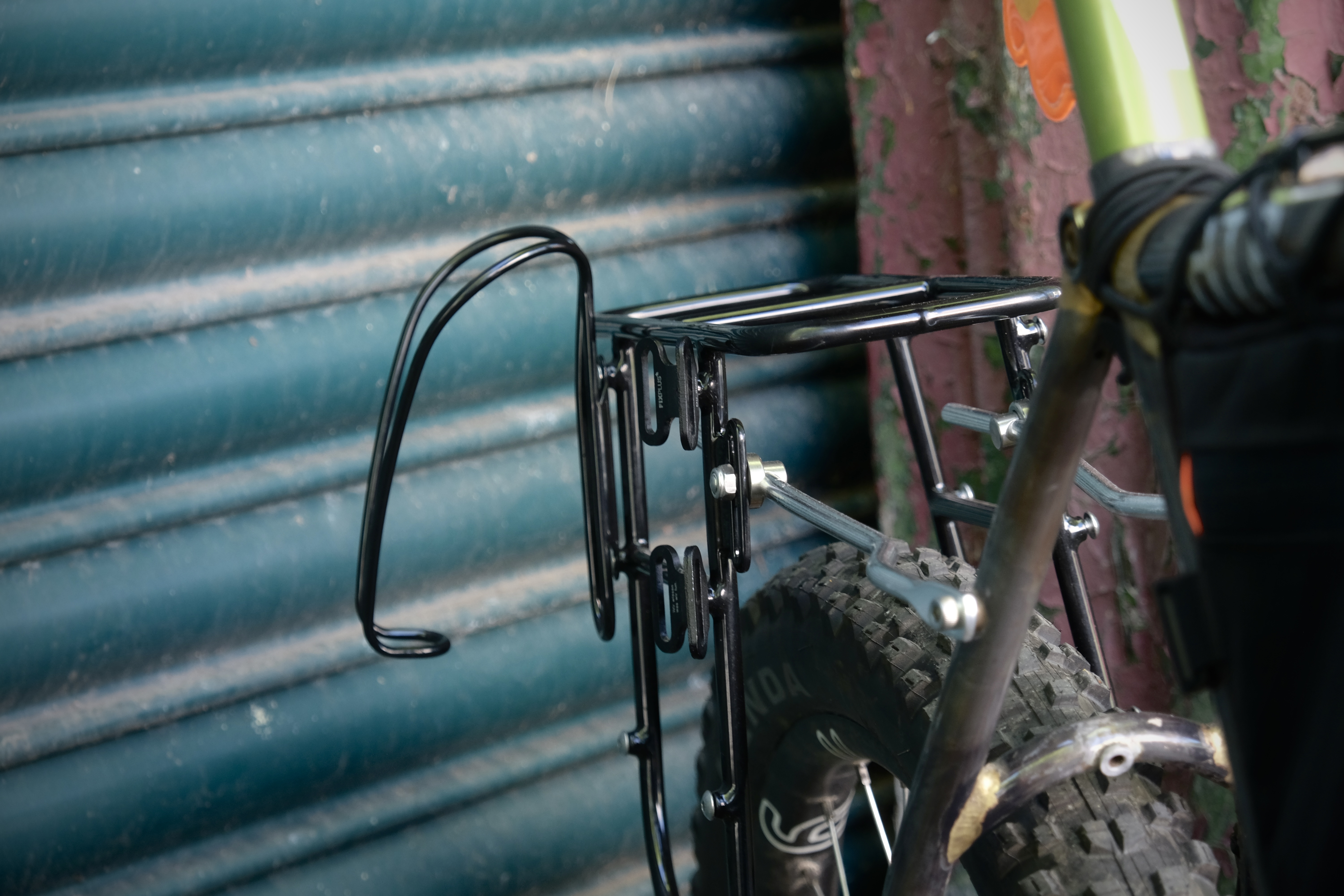 The racks front and back are both from Velo Orange. The front one is the Flat Pack rack. I wanted something more for soft luggage like tents and sleeping bags, things like that, to put on the front. The one I have on the back is the There And Back, which eventually I’m trying to get my friend who makes my custom bags to make me something that fits on there as well.