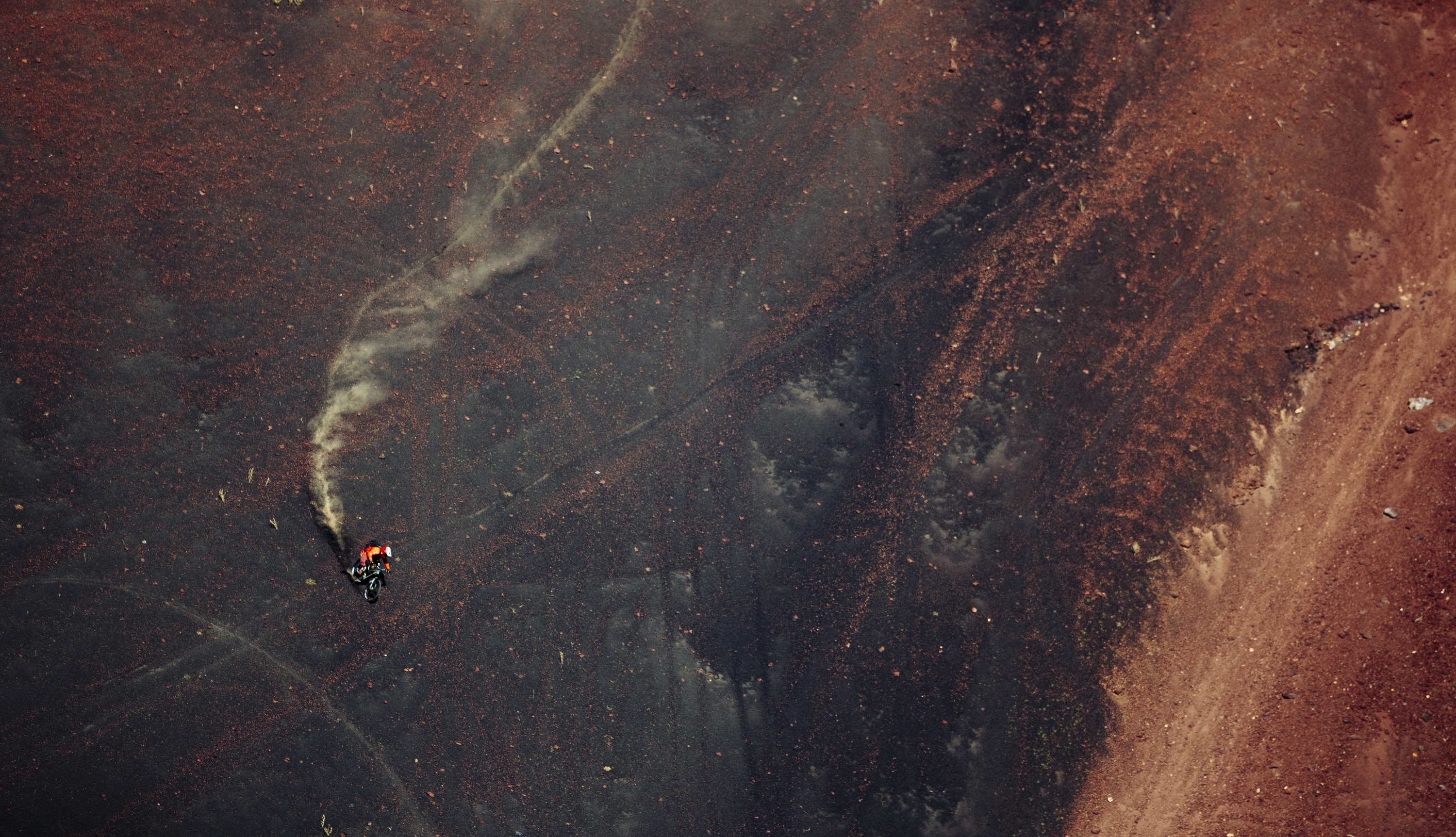 There was this amazing Gary Perkin [photo] at a Cape Epic. This unbelievable shot, more than 15 years ago, from the helicopter, that was like two shadows, two riders in the desert. You see this long shadow, of the two riders. And, at first, I remember, ‘What is that?’. While now, the zenith perspective, with the drone, is so basic that nobody even [notices]. So, I think that the angles are done. You need to be creative in other ways…lights, and shooting at night, or do a complete setup shot. But it’s really hard to imagine how to be creative these days, to do something new.