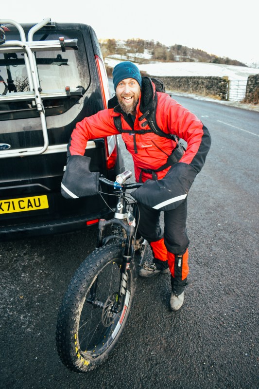 Undeterred by what some might take as a sign to change plans, we were soon all loaded up in my car and heading along the shores of Ullswater on a crystal clear January morning, the surrounding fells resplendent in their heavy coat of white. After a slightly too close for comfort call with a gritter who apparently did own the road, we were readying ourselves by the roadside near Troutbeck. Joining us on our fat bike adventure was Kevin’s friend, James. A model boat builder by trade (how cool is that?), James is an experienced outdoorsman who is well practised in the art of travelling over snow, whether on foot, by ski or bike. Resplendent in full winter gear that a mountaineer would be proud of – salopettes, knee-high gaiters, winter walking boots and quite possibly the thickest (and warmest) fleece-lined smock this side of that ’90s favourite, the Buffalo, he looked like a throwback to 1985. All that was missing was a period original Saracen Kili Flyer. Hefting his generously proportioned rucksack over his shoulder, he outlined its contents, which included a pair of 12-point crampons. I thought I was Mister Prepared but James was taking it to a different level as he enquired whether he should bring his ice axe. It would not have surprised me if he had pulled out a ‘just in the off chance I might need it’ flame thrower, should we get trapped in a storm and have to fight our way out of the mountains.