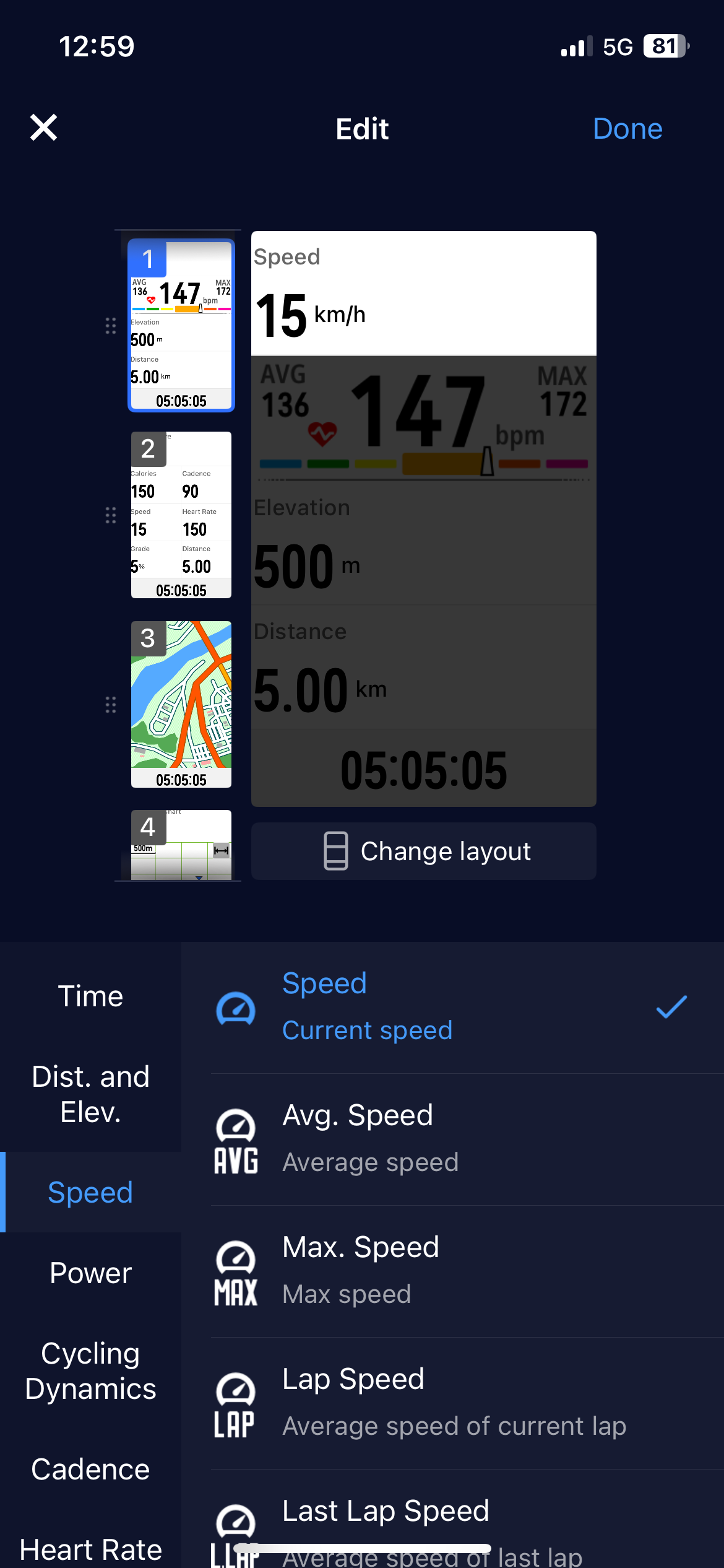 All of that can be displayed – or not – on the screen in front of you. Using the phone app, you can pick and choose what the screen will display according to what you need. Plus, you can have different screen arrangements for different types of riding. Choose from road, indoor, gravel, mountain bike, e-bike, and e-mountain bike, and pick whether you want a nice big display of your heart rate, the map, your cadence… whatever. This is absolutely zero faff to set up, and the phone app generally is nice and easy to navigate.