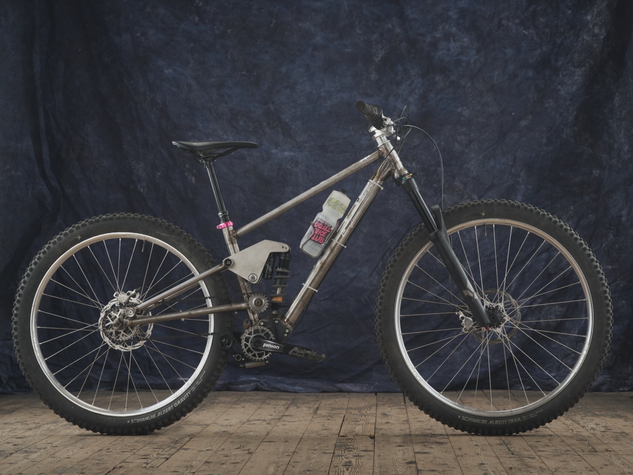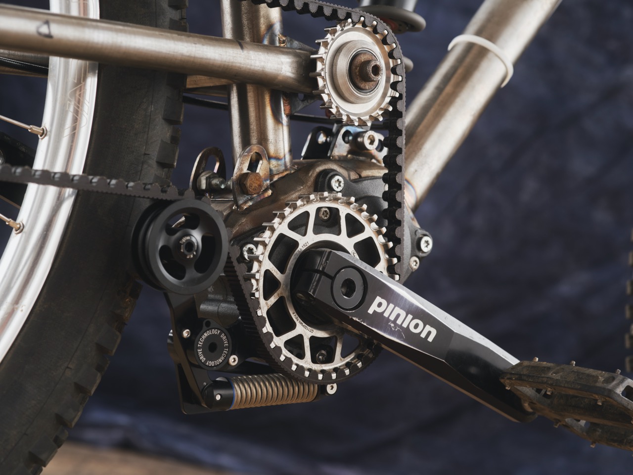 This is a Pinion gearbox, belt drive, full suspension, mountain bike. It’s an idea I’ve wanted to build for quite a few years. This one in particular, I’ve made it quite adjustable so that I can learn more about suspension by changing it up and set it up in different ways for different uses and just learn from it.
