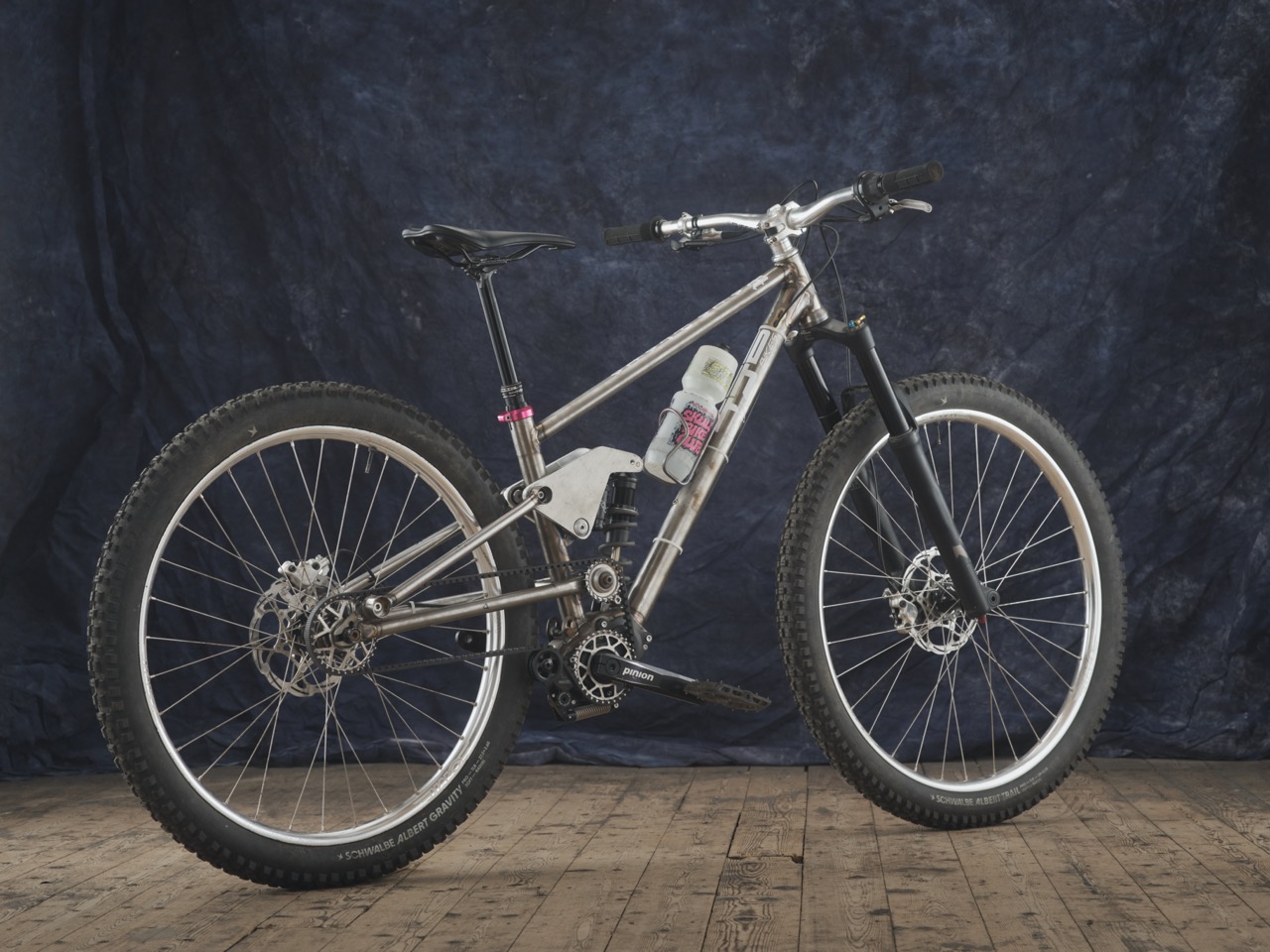 At the moment I’ve got a 27.5 inch wheel in the back and 29 on the front. I’ve got the Selva fork which has got the negative air spring. You can pump that up to suck the fork down and change the travel. I had that on my hardtail and I was changing it from 140 to 160mm travel and changing the wheel size.