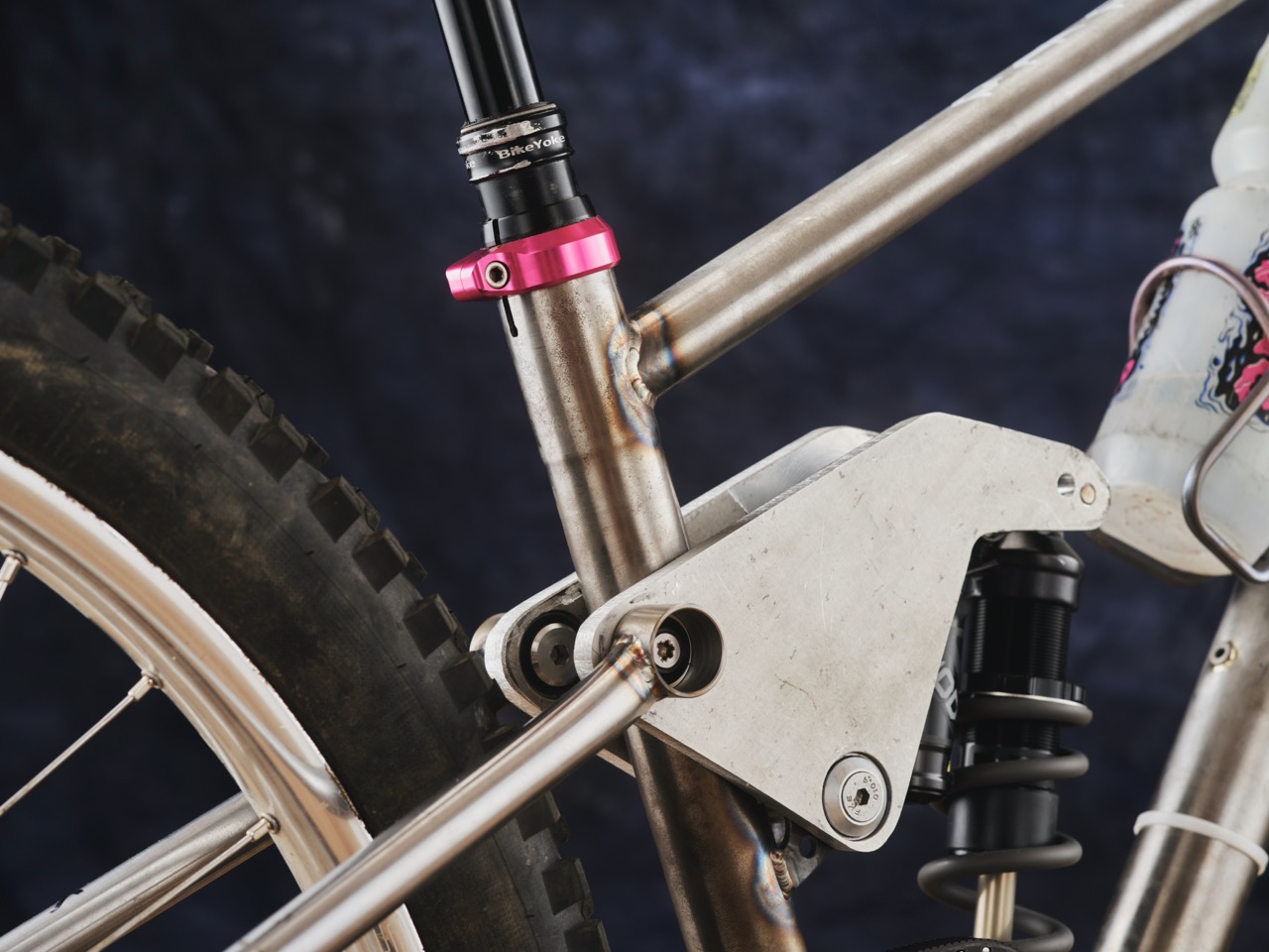 Yes, it’s going to be 160mm travel with a 230mm shock and be able to run it at 140 travel with a 210mm shock, which it is at the moment because I didn’t have any 230mm shocks left. The shock turned up yesterday and I realised it wasn’t going to fit so I had to hack these linkage plates.
