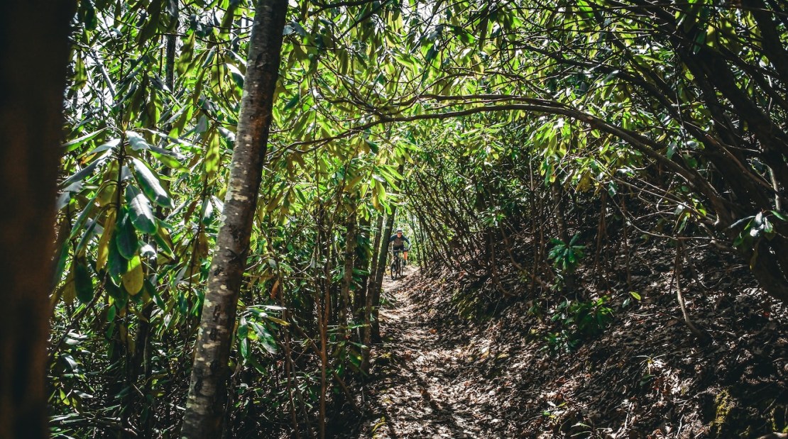 Next day, I’m up early, though when I park up a fisherman is already catching trout in the dawn light. I pedal up the erroneously named Laurel Mountain. I don’t see a single laurel all day – the trails are actually in tunnels of rhododendrons. Josh tells me this is the absolute trademark of riding here. Hemmed in on all sides by greenery, it feels like you’re riding at warp speed as leaves blur by inches from your face.