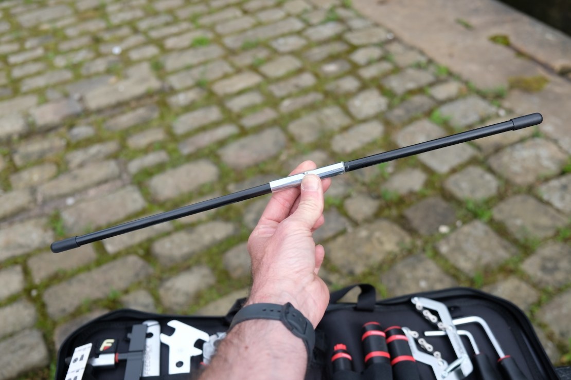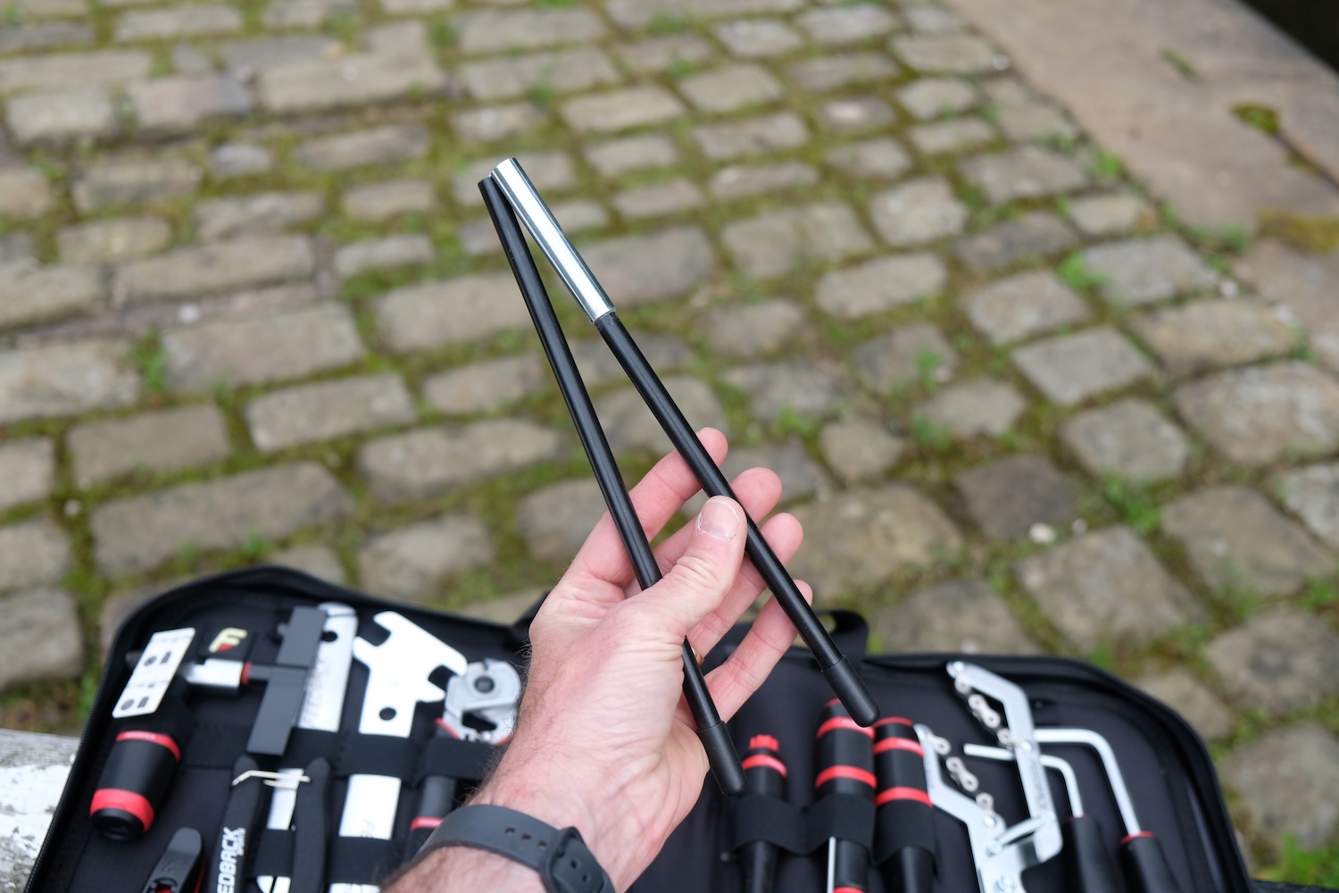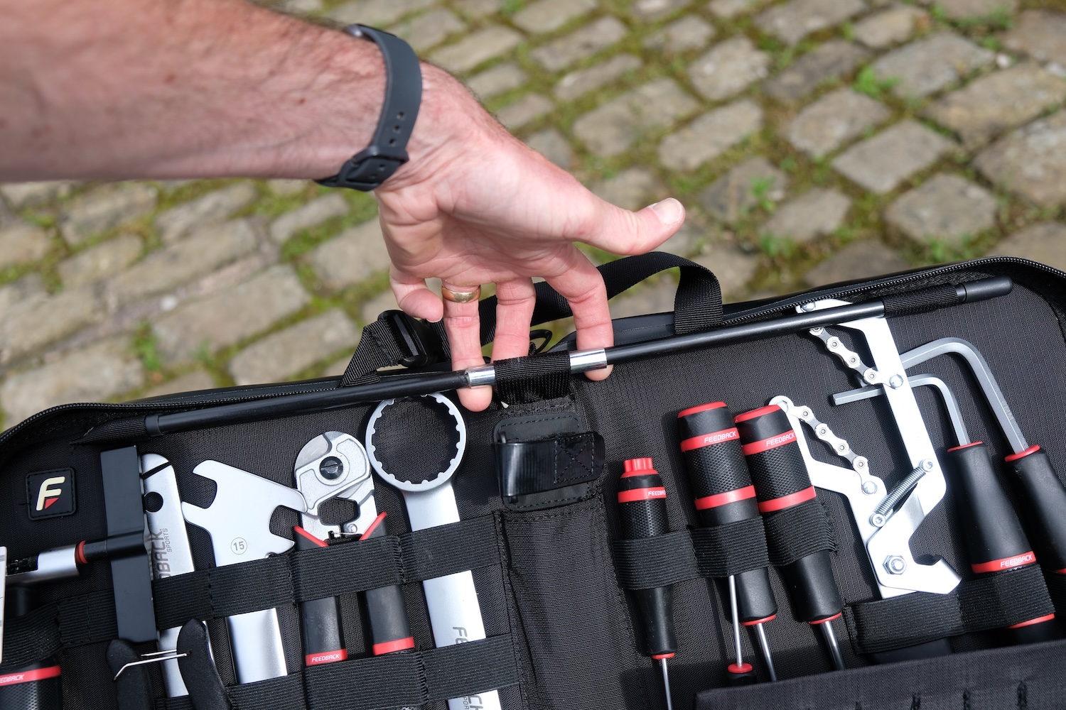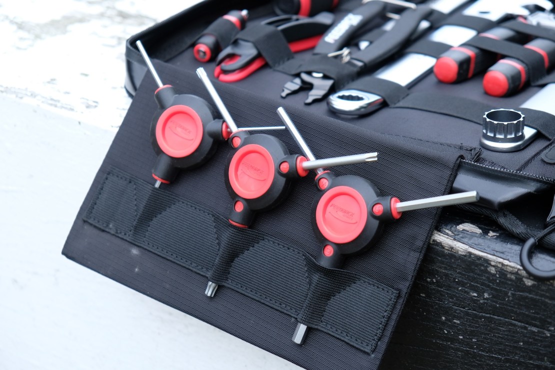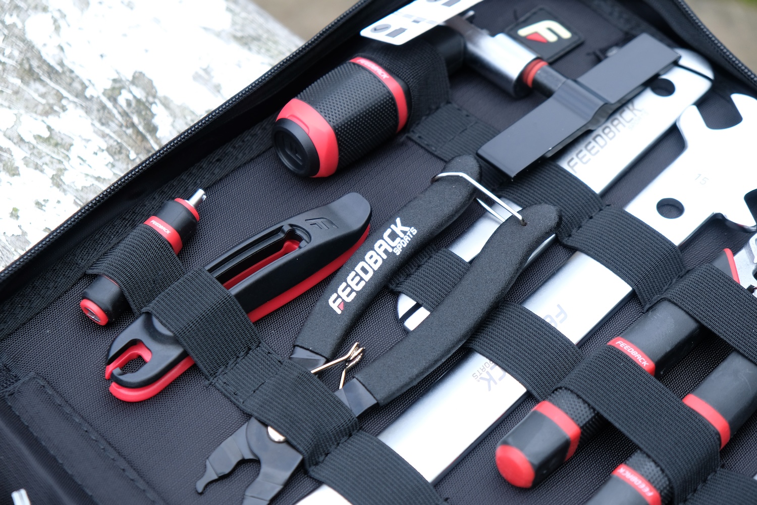 Designed as a starter race day kit. It will hang on a repair stand, or a handy fencepost or tree branch perhaps? Feedback Sports consulted its own staff to compile the kit as well as recommendations from pro racing mechanics. The kit includes 20 ‘professional grade’, bike-specific tools with 26 functions. The tools are housed in a water-, grease- and abrasion-resistant TPU-coated case and has inner reinforcement and external attachment to hang nicely. As a bonus, car thieves will just assume it’s a multi CD case holder from the 90s and leave it behind.