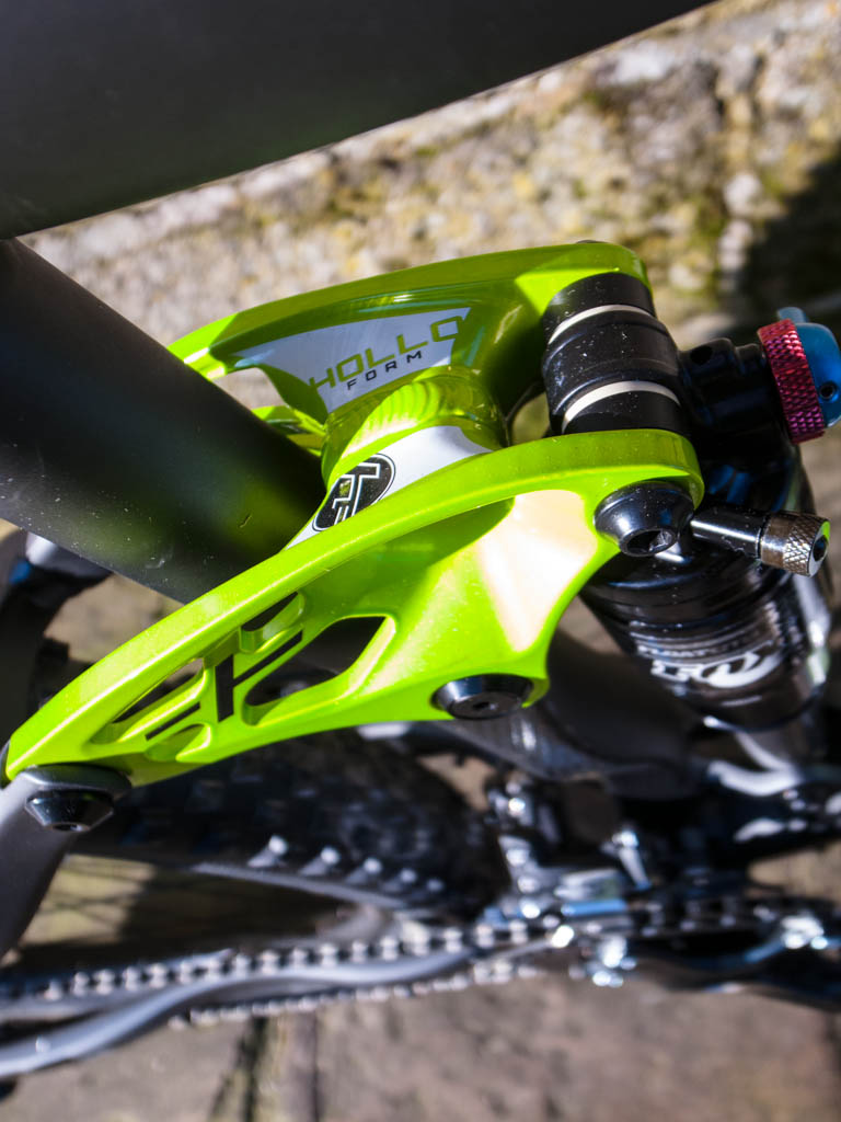 “It certainly looks the part with Slimer-green highlights, a 142mm back-end, genuine four bar linkage, tapered headtube and some rather fancy hydroforming.