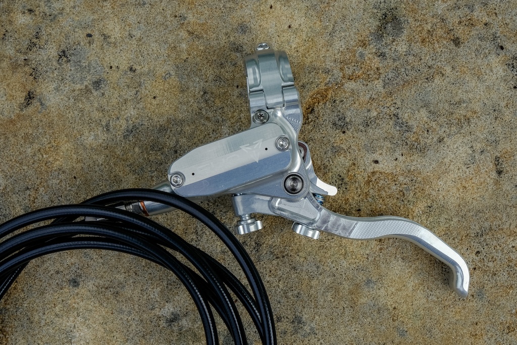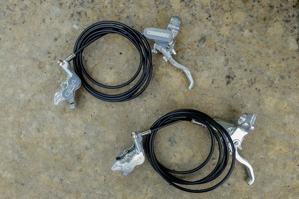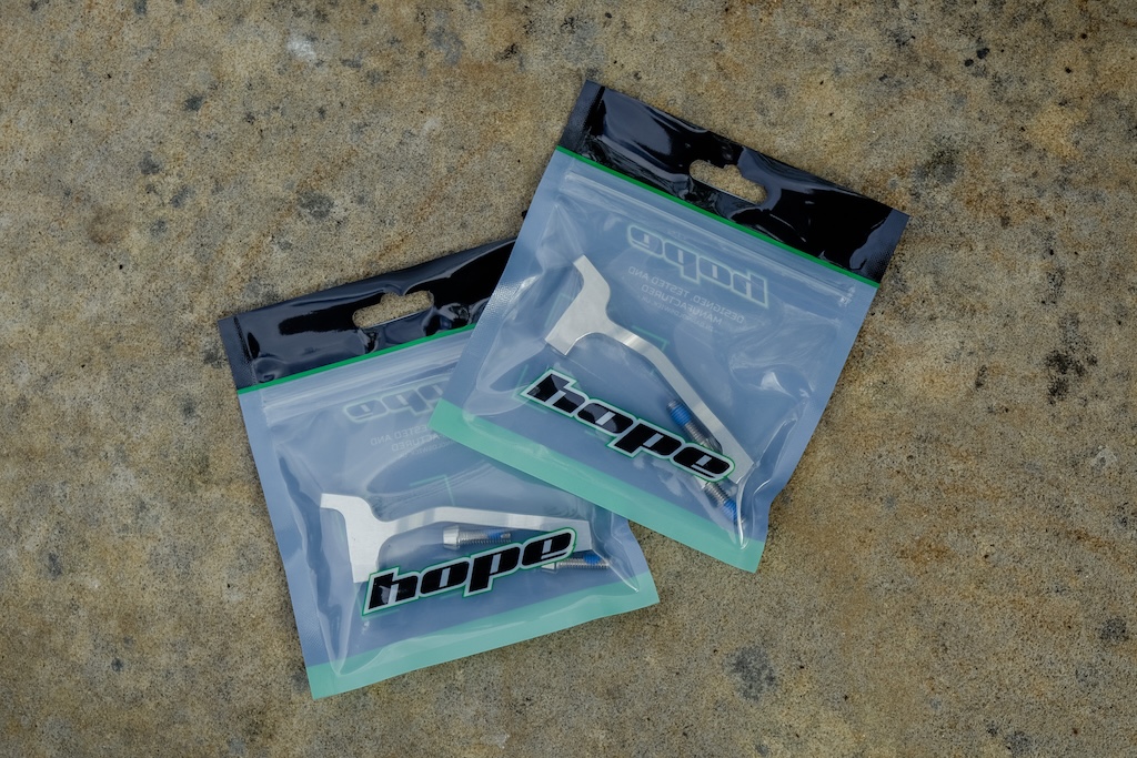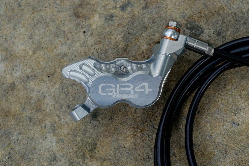 Four-piston ‘gravity’ brake from Barlick*. Hope’s new benchmark brake for gravity and e-bike use. There are three different lever blade options (they come with Standard as… er, standard). There’s also Power and Control levers. We’ll be getting hold of all the levers for the test. All blades feature reach and bite point adjustments. Hope: “A new cam designed to decrease the free lever stroke while maintaining the feel and modulation in the braking zone — a key feature of the Tech 4 brakes. The result is a slightly firmer feel at the bite point, followed by a gentle rise in power through the braking zone, further enhancing brake modulation. Roller bearing main pivot is carried over from Tech 4 along with sliding guide bush on the main piston. Additional secondary guide bush keeps the piston running perfectly straight to maintain super smooth piston movement throughout the full lever travel.”