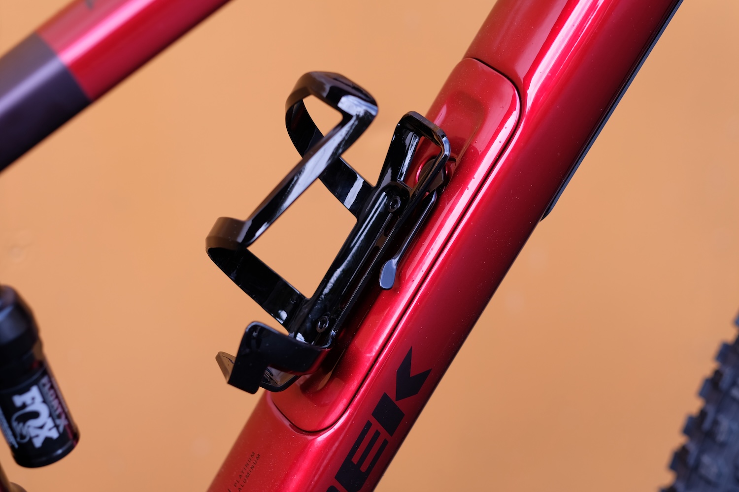 The down tube features a revised version of Trek’s internal frame storage. The opening is bigger. The seal is tighter. There’s two sausage bags in there. And the cables are better tucked away from interfering with inserting/removing the sausages. The storage lid is where you attach a water bottle, which can be a full-size bottle as front triangle room is more than ample.