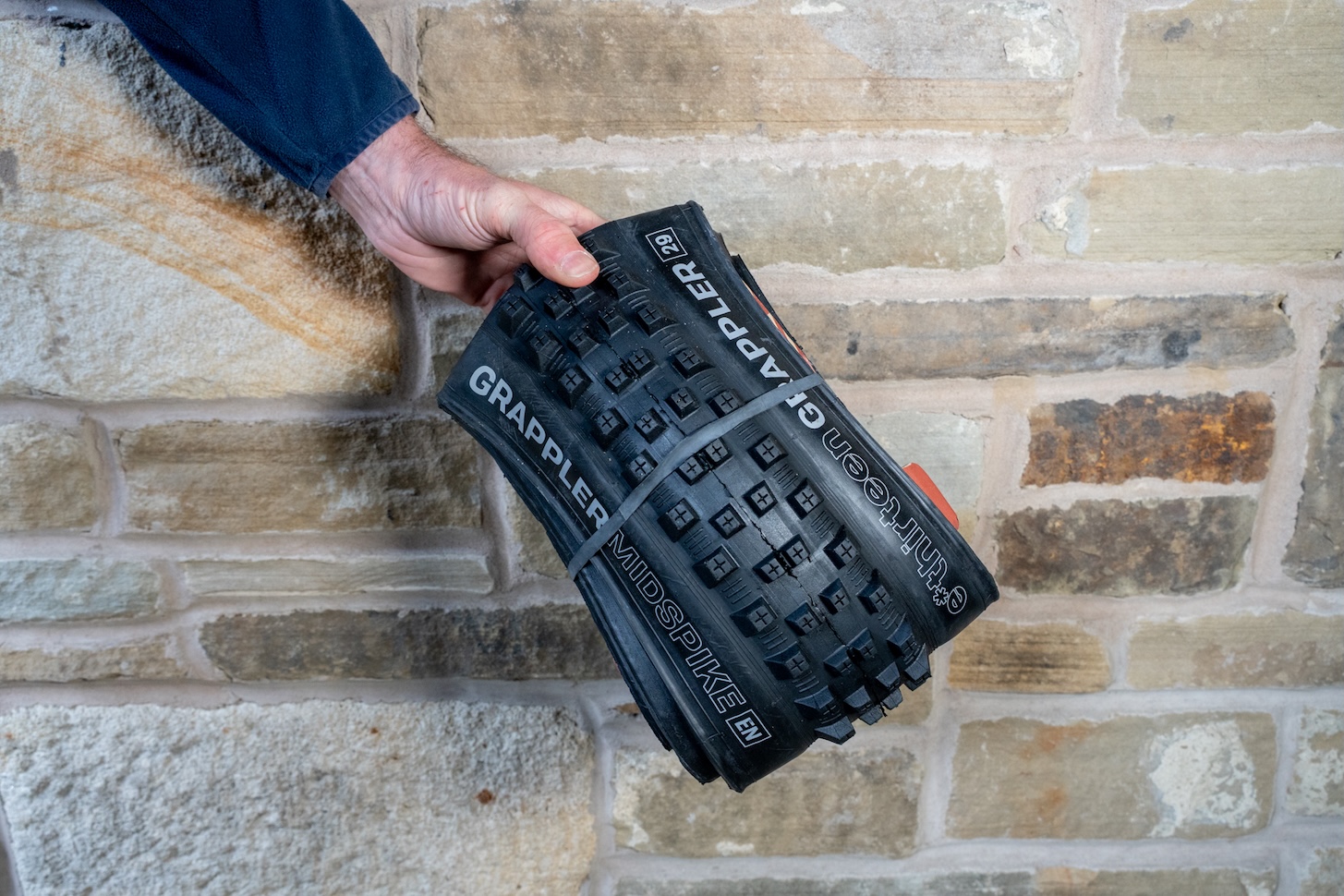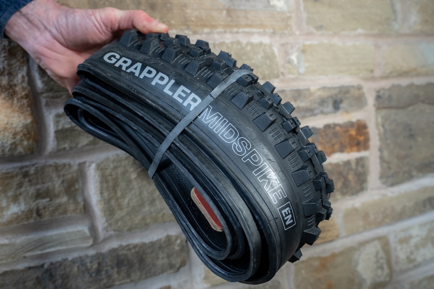 We never say no to testing a mud tyre. This is the latest from E-Thirteen. The Grappler Mid Spike claims to perform not only in the mud but also on roots and rocks. 90tpi x 1.5 ply construction, under-tread reinforcement, apex sidewall inserts. 42a Mopo compound. E-Thirteen: “The widely spaced, angled, and offset tread pattern sheds mud quickly and punches through dirt while still providing consistent support and traction leaning into turns. Siping on the pyramid center and sidewall knobs work in harmony with the supple casing, conforming to the terrain to maximize cornering and braking grip.”
