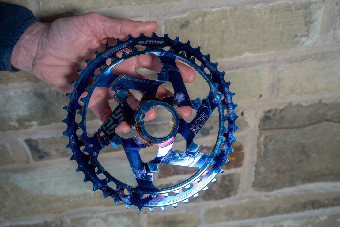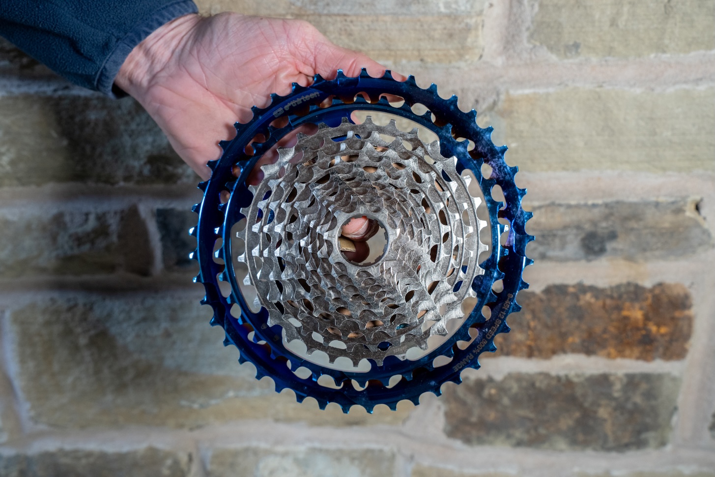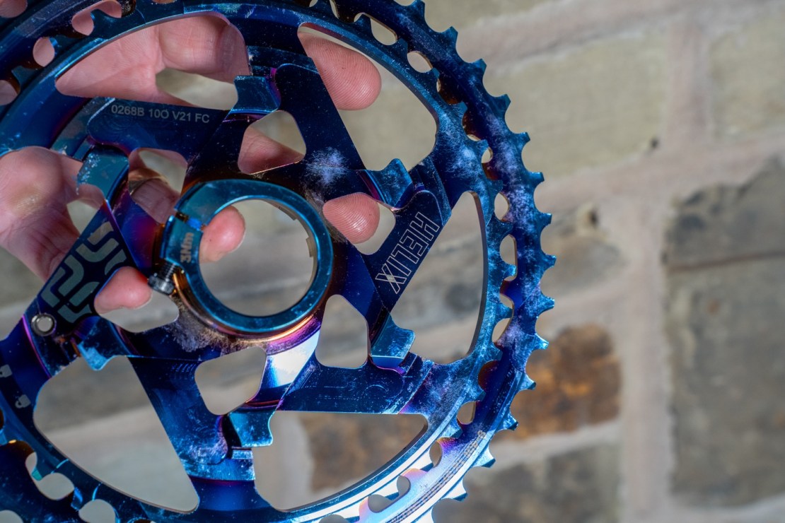 Benji doesn’t often overly look at the weight of things (“function is all” etc) but for his Pace Project (see Fresh Goods Friday 772) he’s been bookmarking Weight Weenie Websites and getting his orders in. Hence this spangly cassette from E-Thirteen. 500% Range, 330g. XD/XDR driver only. Two aluminium cogs, ten steel cogs. ‘PVD ‘finishing on Intergalactic model claims to improve durability.