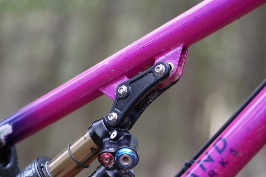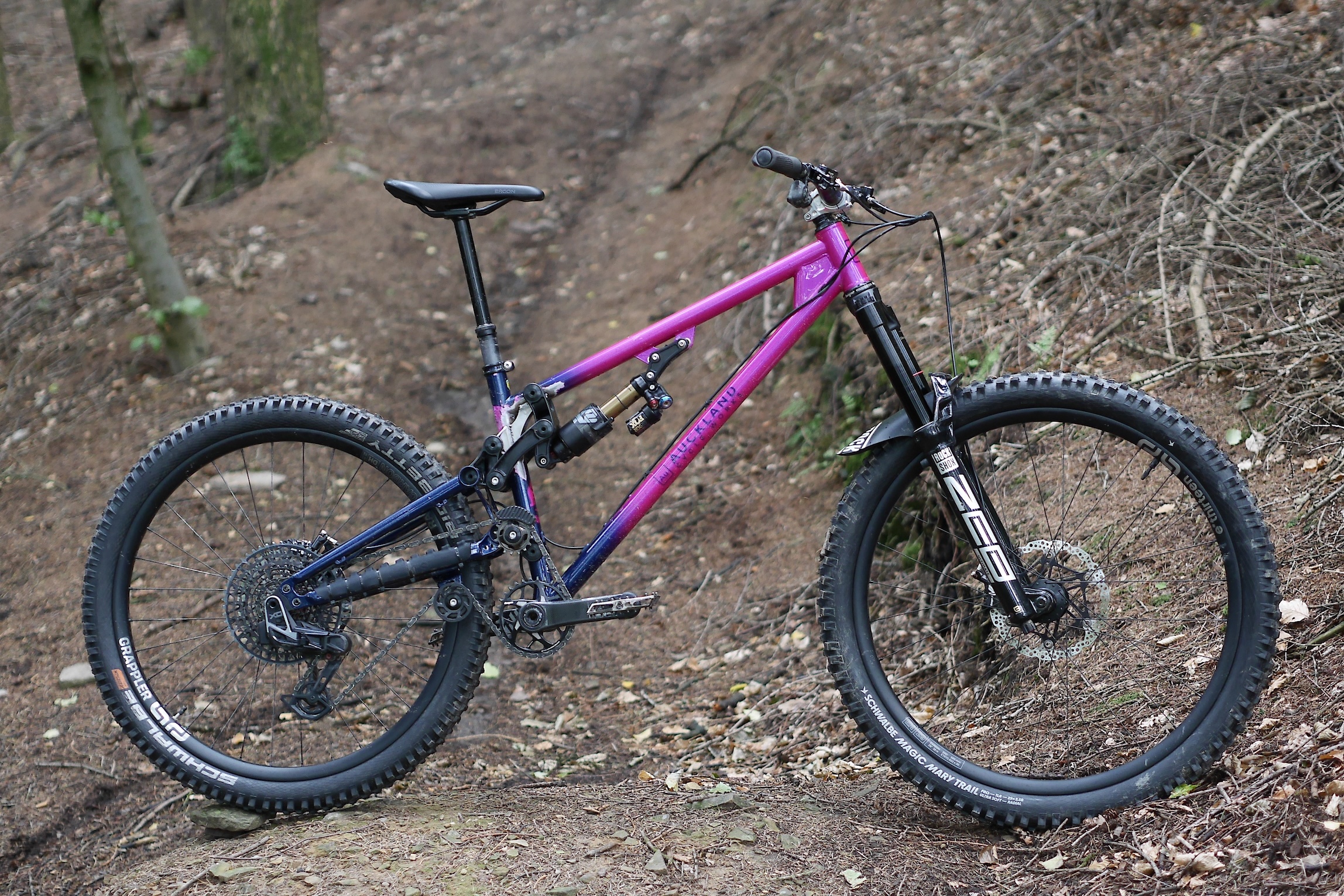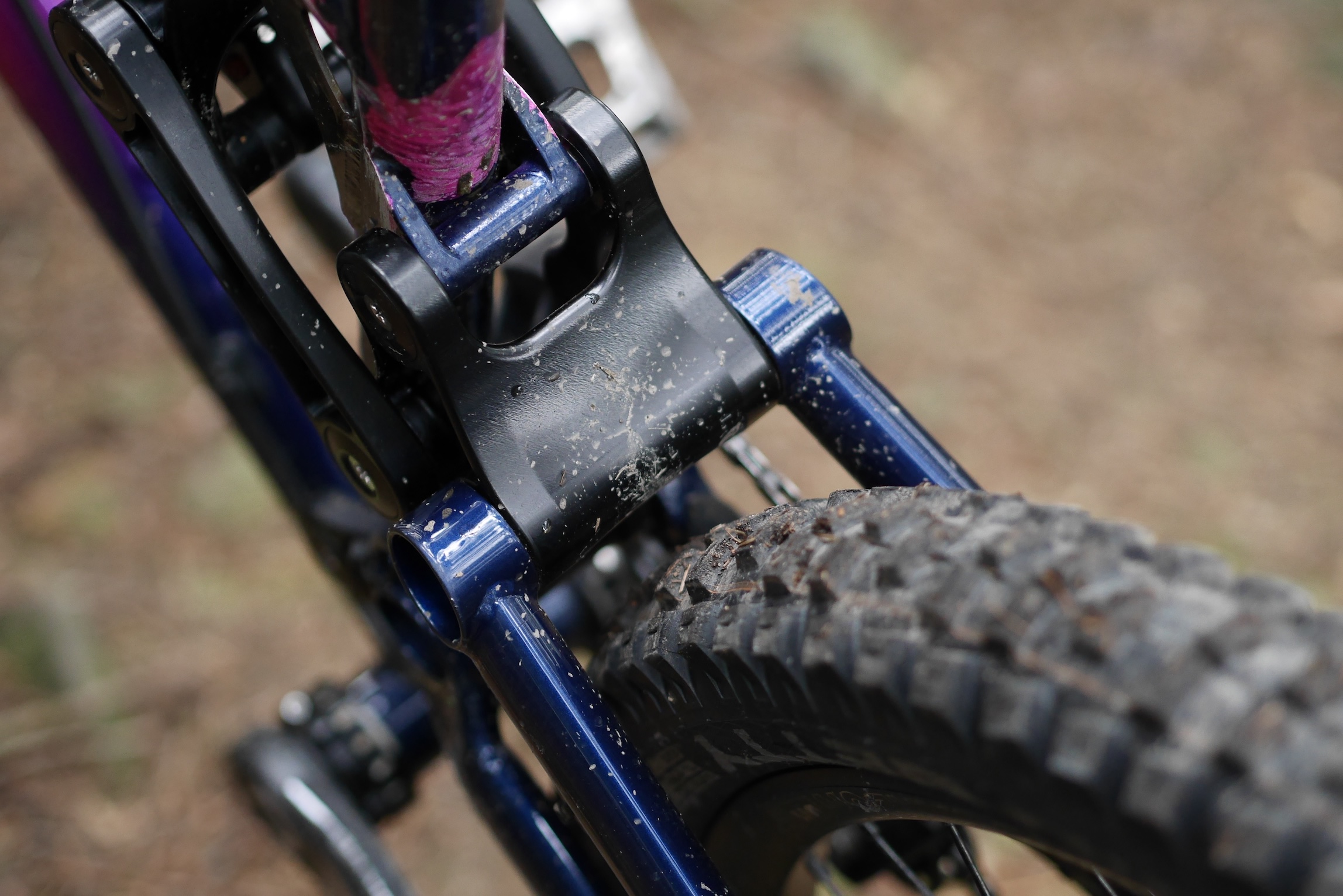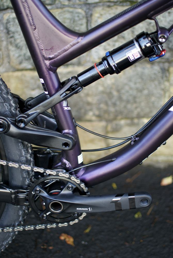 Back in the pre-DownCountry Days we wrote: “This lovely slice of purple landed in the office for our upcoming test on short-travel 29er long and low gnarbikes. Our XL test bike has a whopping 26″ top tube, and an unsurprising 111mm of rear travel … with 120mm of Pikeyness up front … Super-burly linkages. Rawr. … Lots of linkages help keep the chainstays supershort, which means there’s no room for a front mech. Not a problem, as it runs a SRAM 1×11 groupset … It comes with a press-fit BB and some super-burly looking pivots and stays.”