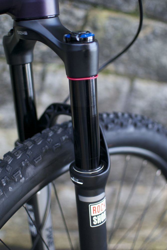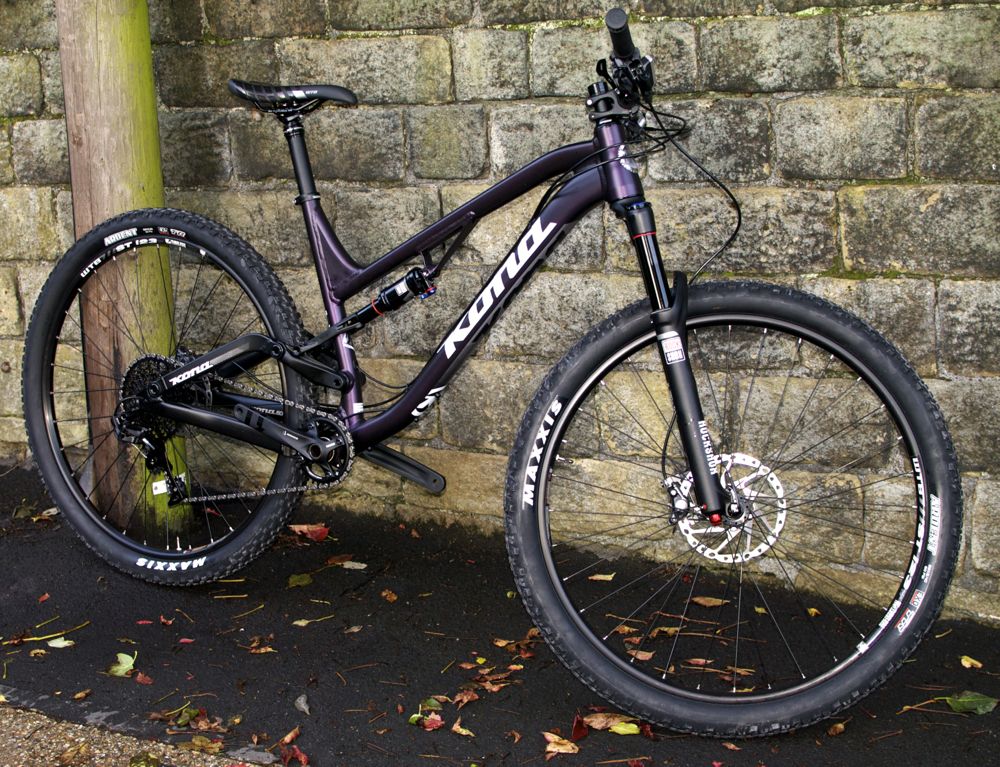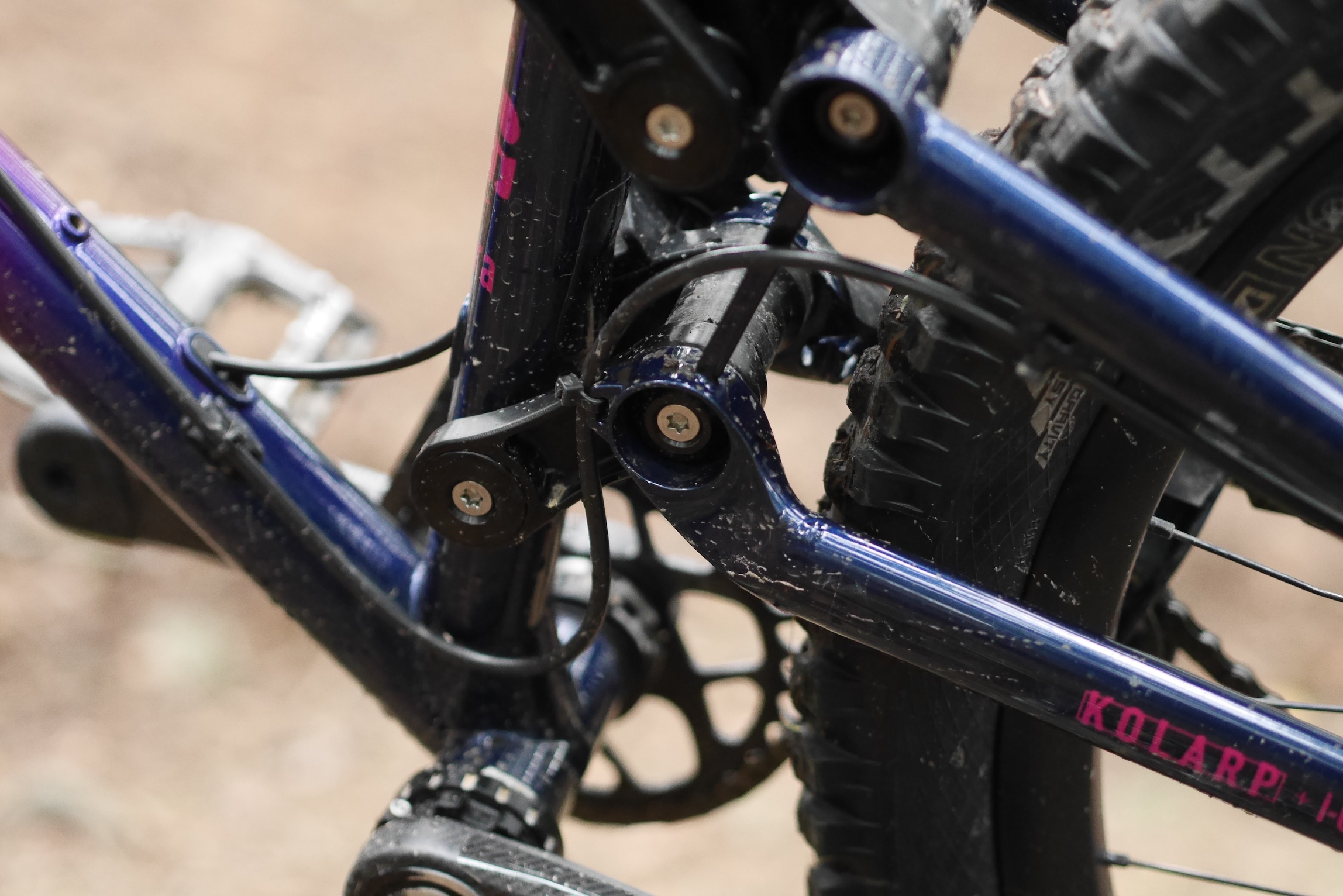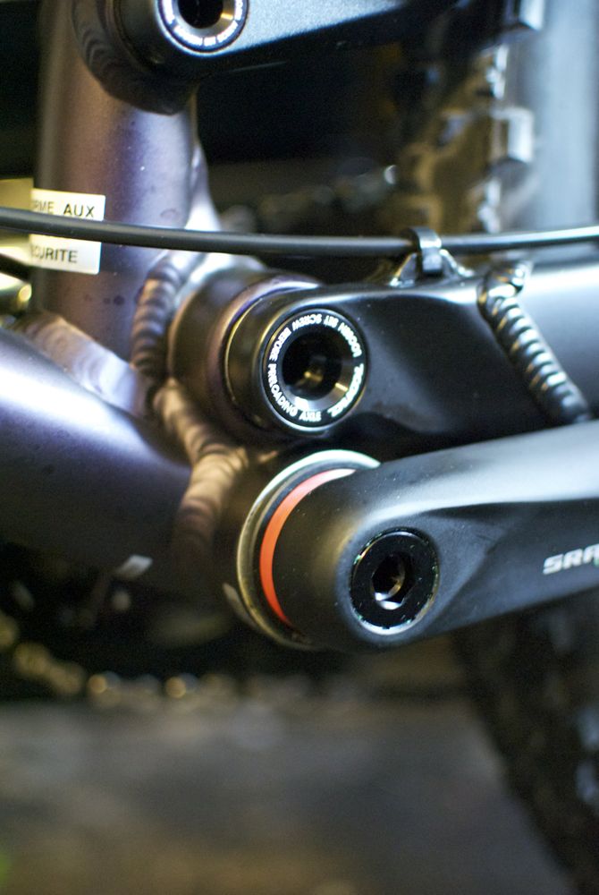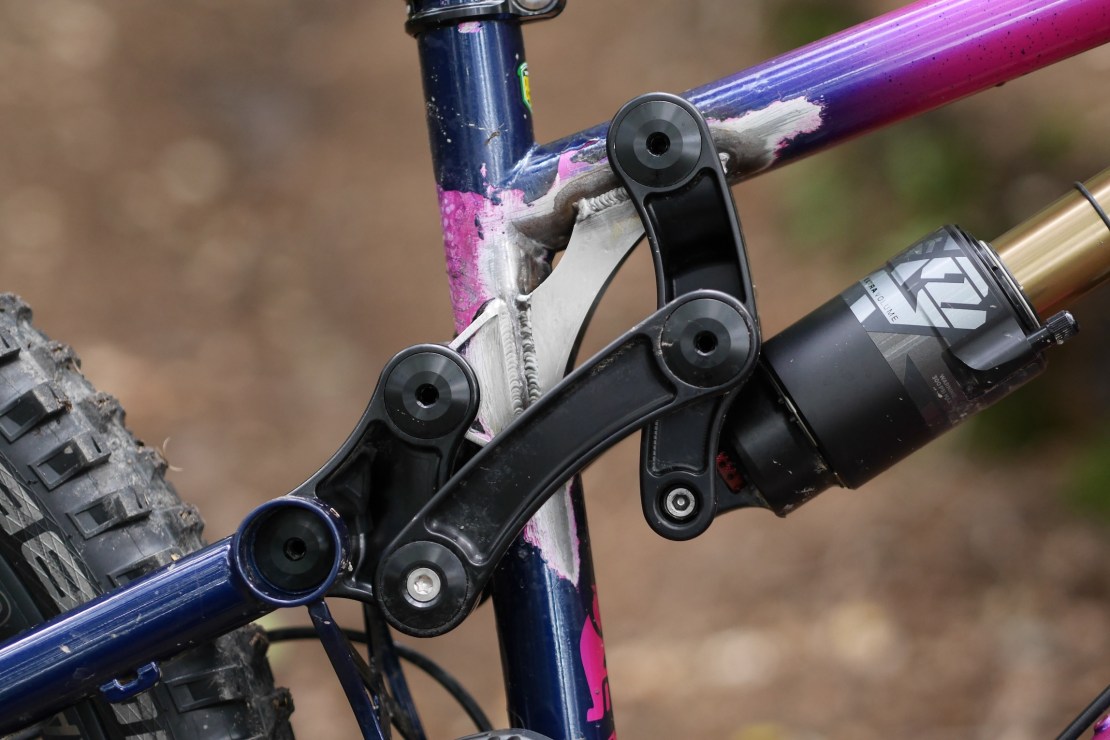 Back in the pre-DownCountry Days we wrote: “This lovely slice of purple landed in the office for our upcoming test on short-travel 29er long and low gnarbikes. Our XL test bike has a whopping 26″ top tube, and an unsurprising 111mm of rear travel … with 120mm of Pikeyness up front … Super-burly linkages. Rawr. … Lots of linkages help keep the chainstays supershort, which means there’s no room for a front mech. Not a problem, as it runs a SRAM 1×11 groupset … It comes with a press-fit BB and some super-burly looking pivots and stays.”