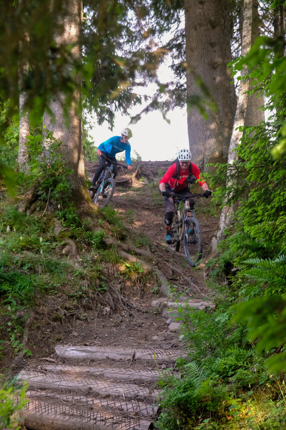 Reaching the end of the trail proper, we found ourselves on a wider and more open track that eventually took us onto one of the main Les Gets pistes. Not keen to drop down on a wide and frankly dull piste, we followed a vague but marked grassy track that took us back into the woods and which by sheer luck took us onto the bottom of the trail we had so thoroughly enjoyed that morning. Winner, winner, poulet dinner, as we now say in France. We had gone in search of trail treasure and come up trumps with a real haul of riding delights. Reflecting over a mightily fine, pizza at Le Comptoir later that evening, we all felt that it was a case of mission accomplished. Despite it being almost ghostly quiet at the start of the season, we had met some truly lovely people, enjoyed great food and hospitality and – most importantly – ridden some terrific trails that more than met our hopes for this part of the adventure. Nice one, Les Gets. We came, we rode and you smashed it, quite literally, out of the park!