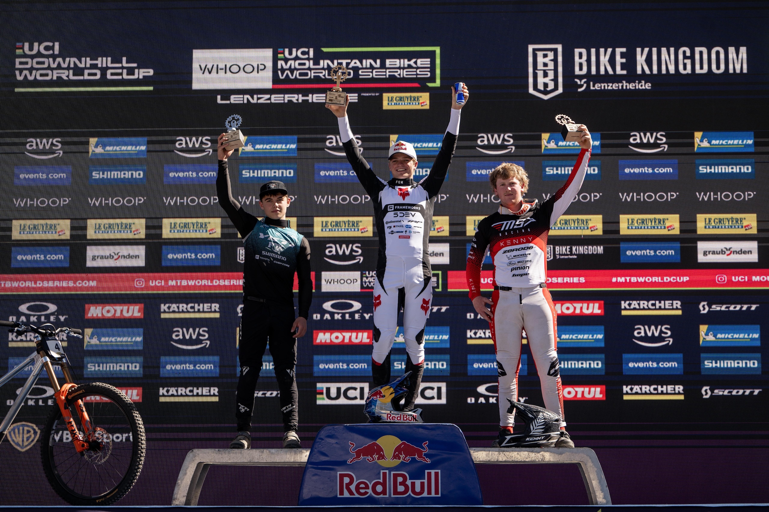 Asa Vermette mastered the slopes of Bike Kingdom – Lenzerheide and took his first Men Junior UCI Downhill World Cup win of the season. The 18-year-old has been consistent this season with four UCI Downhill World Cup podium finishes this season, but a win had eluded him prior to this weekend.