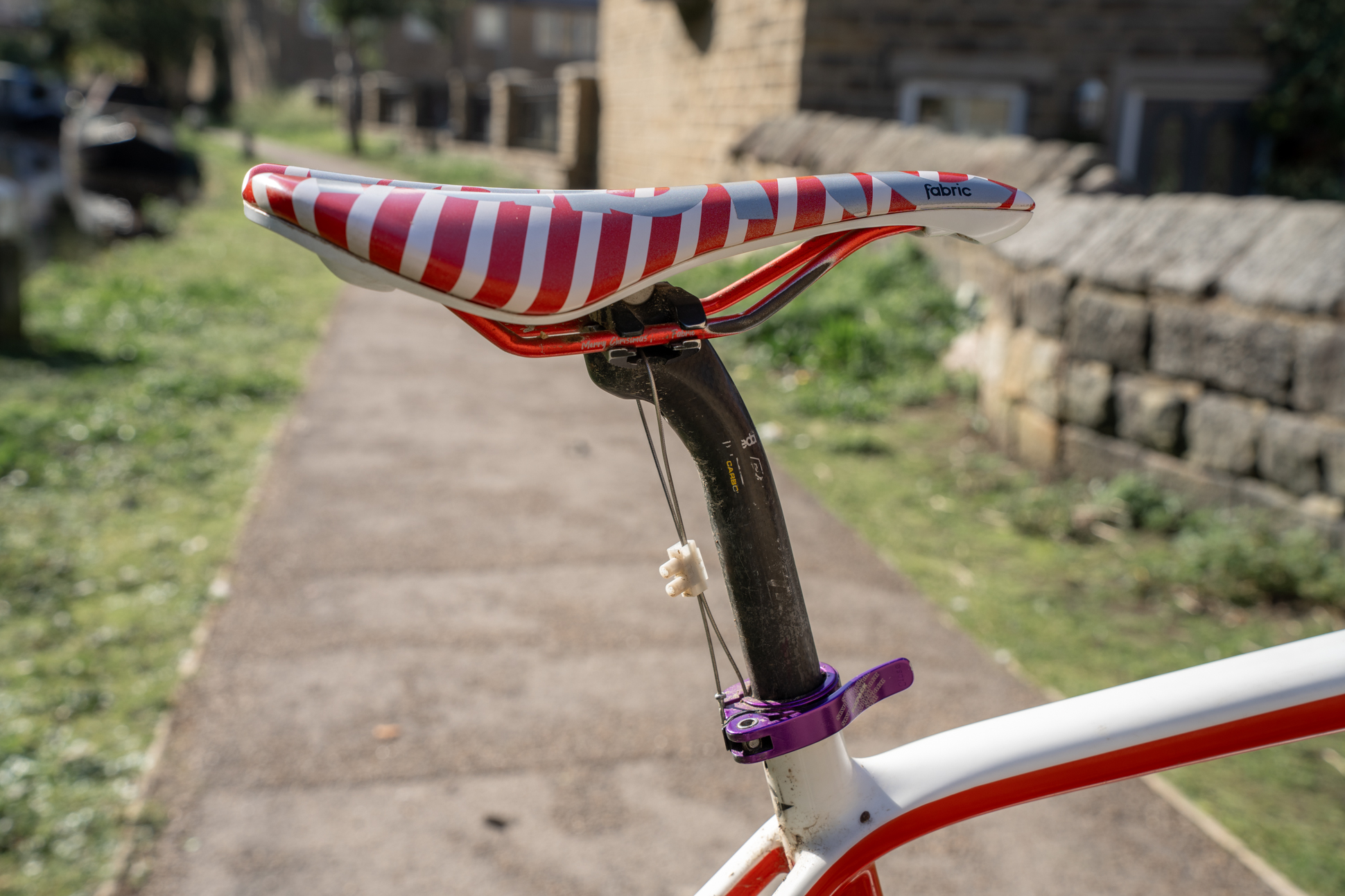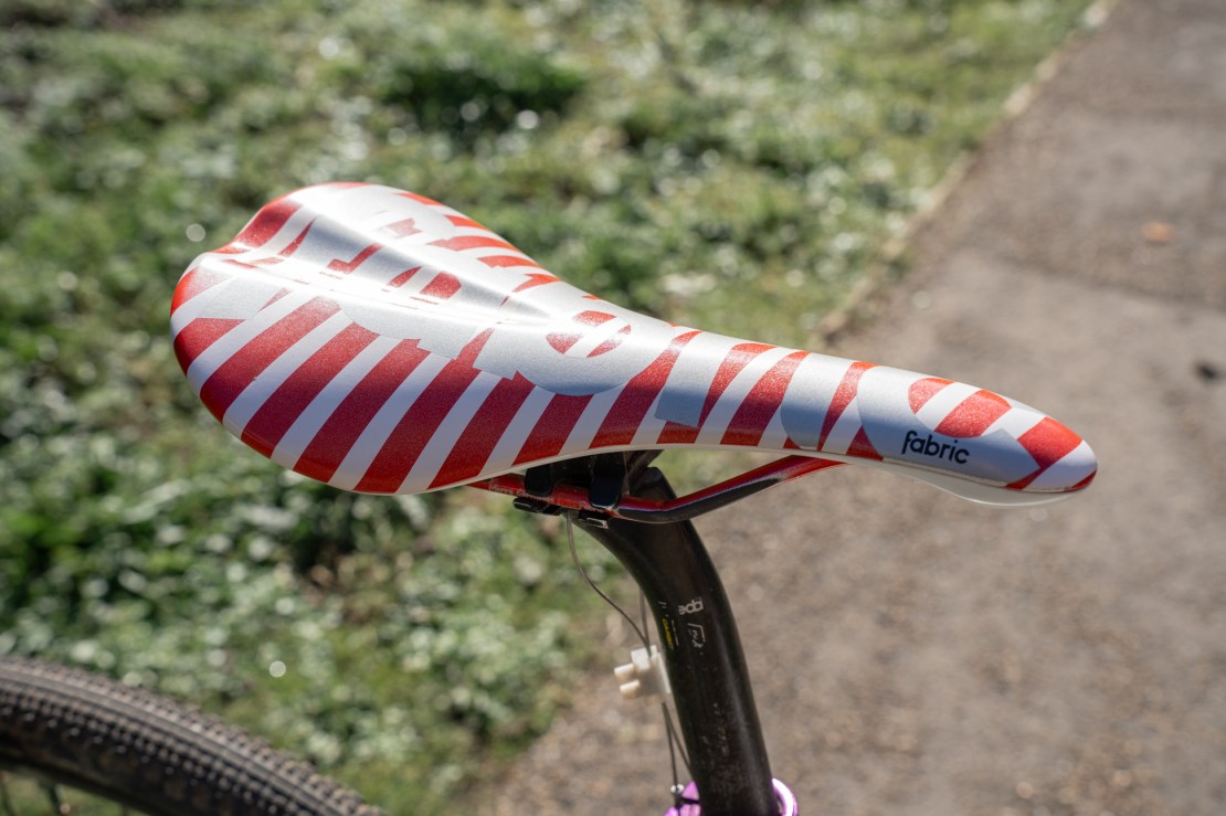 And the final piece in the Peaks puzzle is probably the one that gets the most double-takes. mounted to the snazzy ‘Merry Christmas from Fabric Cycles’ saddle is an old gear cable, joined in a loop with a junction box and passing through a gap in the seatpost QR collar. This marks my full saddle height, so that I can drop the saddle for the worst of the descents and then raise it again, knowing that it’ll be exactly the right height. This can usually be done while pushing the bike and probably only adds 5g to the bike’s weight – way simpler and lighter than adding a dropper post, given that it only gets used about twice in the event.