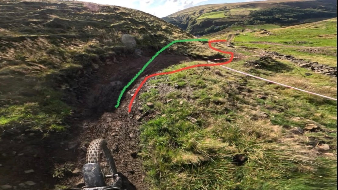 Following this, a steep grassy bank into a big left hander that looked more supportive than it really is was followed by a much nicer right hander and tiny scrub requiring lip. Then followed the ‘Stall Wall’, similar to that of Loudenvielle Downhill World Cup fame (only smaller), riders were spat off the top of a berm into a grassy bank. There was a temptation to boost this bank Goldstone-style, but the flat corner that followed demanded some more sensible riding.