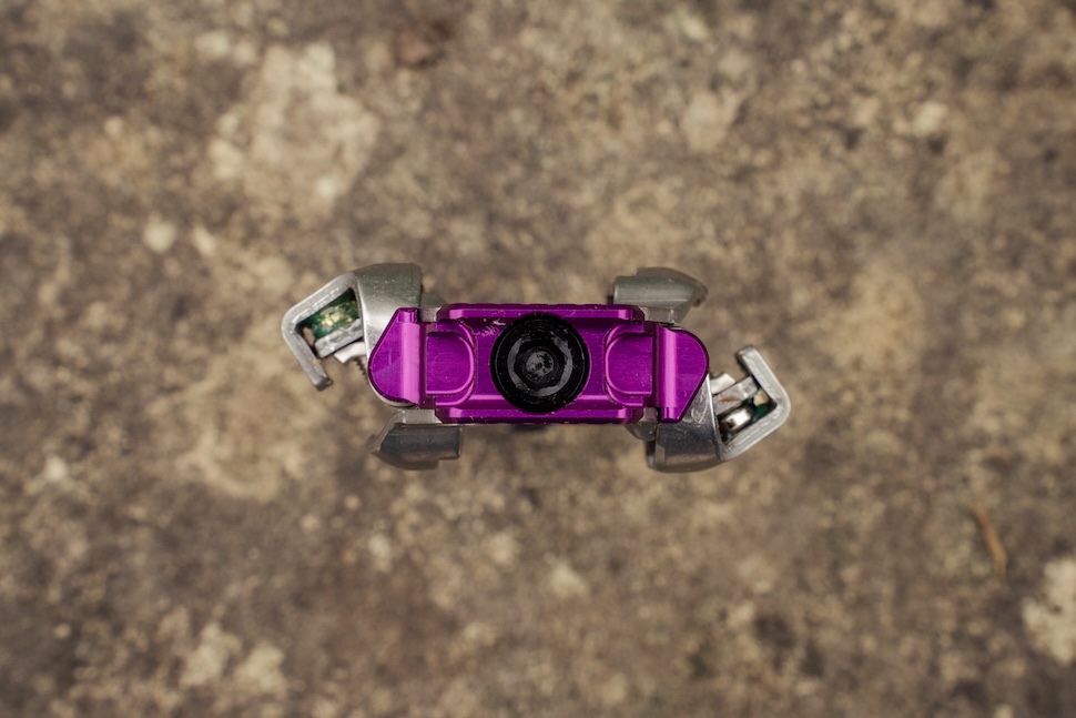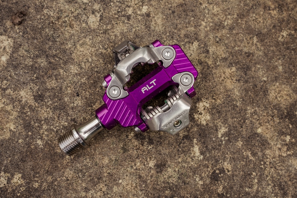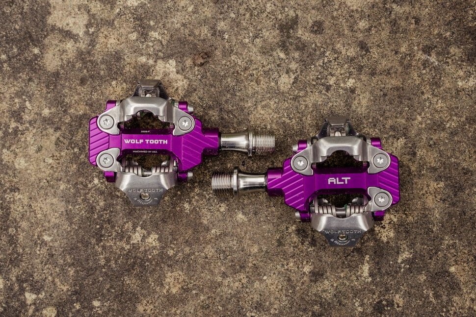 Wolf Tooth makes some mighty fine flat pedals, and here’s (one) of its new clipless offerings. Wolf Tooth’s new clippy peggles come in three flavours: CTRL, ALT and DEL. The CTRL is the wider bodied trail pedal, the DEL is the minimalist gravel pedal and this ALT is the trad XC pedal. Also available in boring black. It uses the Shimano cleat standard. CNC alloy body, stainless steel axle, pretty thin (15mm), pretty light (295g). A neat feature is the adjustable Q factor(51, 55 or 59mm) which is adjusted by rearranging spacers and bearings.