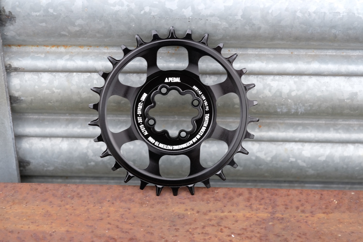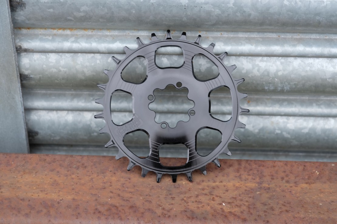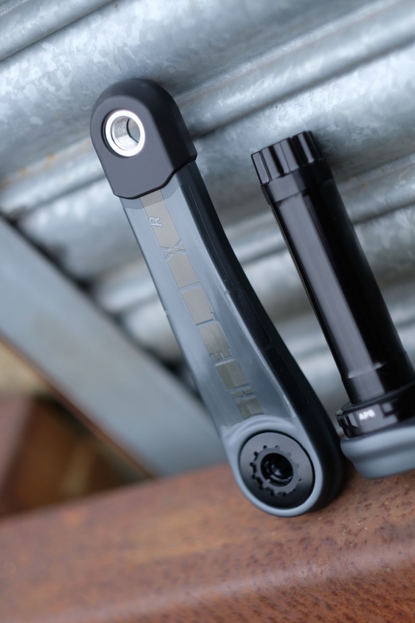 Speaking of low bottoms, these snazzy carbon cranks are a mere 160mm in length. As such they are destined for another bike with mucho BB drop: a Pace RC629. Carbon crank arms paired with a machined aluminum 30mm spindle and an 8-lobe splined interface. With a chainring they weigh in around 415g. Come equipped with crank boots, ‘APS’ preload adjuster, captive pedal washers, and a self-extracting system. The chainring here is a 30T size.