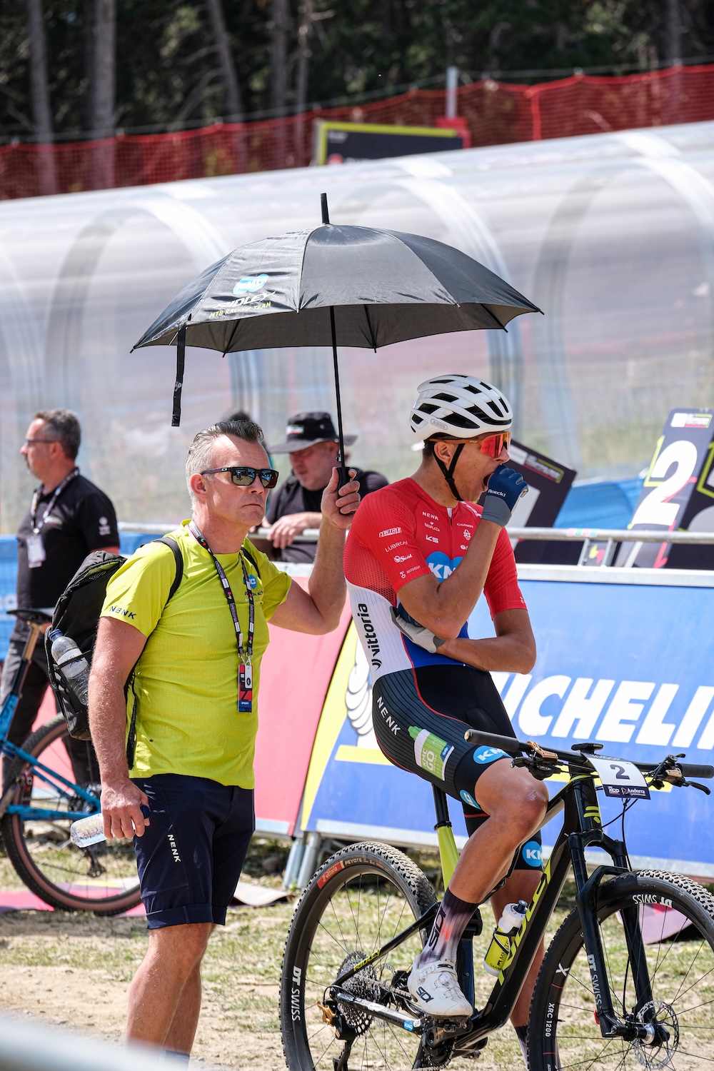 In some ways, the march of technology in bike tech is helping the mechanics. With just about every pro cross-country team running wireless shifting these days, there are no longer any cables to feed through, clip, tension and adjust. Gears work seamlessly, assuming there’s battery power. But that tech comes at a cost of complexity in setup and in mid-race replacements. On a short track race, if you have a major mechanical, your day is likely over, but on a longer cross-country race, there’s still hope to fight your way back up the rankings. And so, replacing wheels aren’t a race stopper.