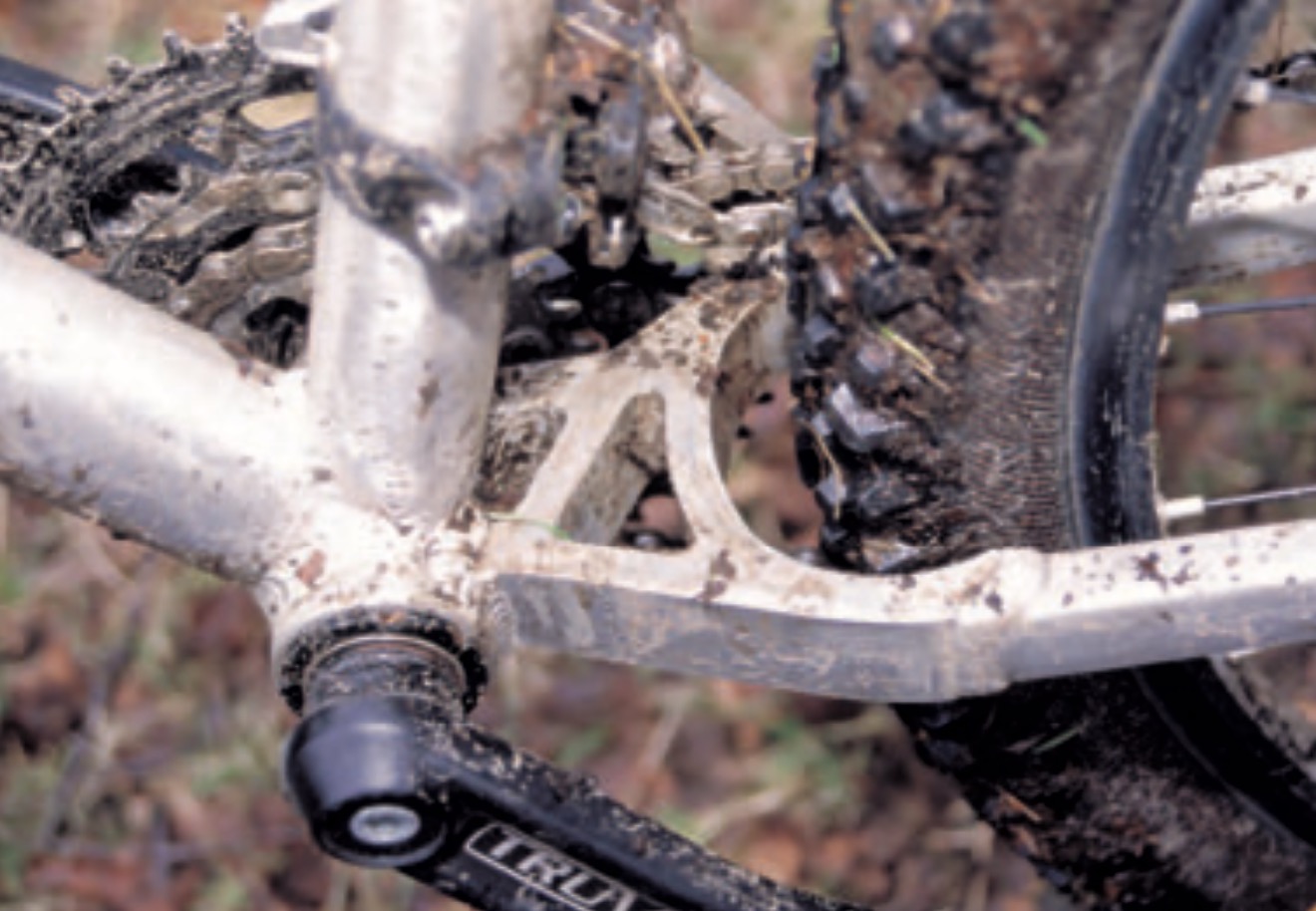 The first thing that strikes you about the Sub5 is the HUGE down tube formed by bending a single thin sheet of 6061 aluminium and welding it into an octagonal tube. The rear swingarm is similarly formed from 6061 sheets and attached to the downtube at the pivot with cartridge bearings running on a spigot sticking out from the downtube; the bearings sealed from the muck with aluminium covers. The pivot being some distance away from the chainrings helps give the Sub5 its 5” of rear travel.