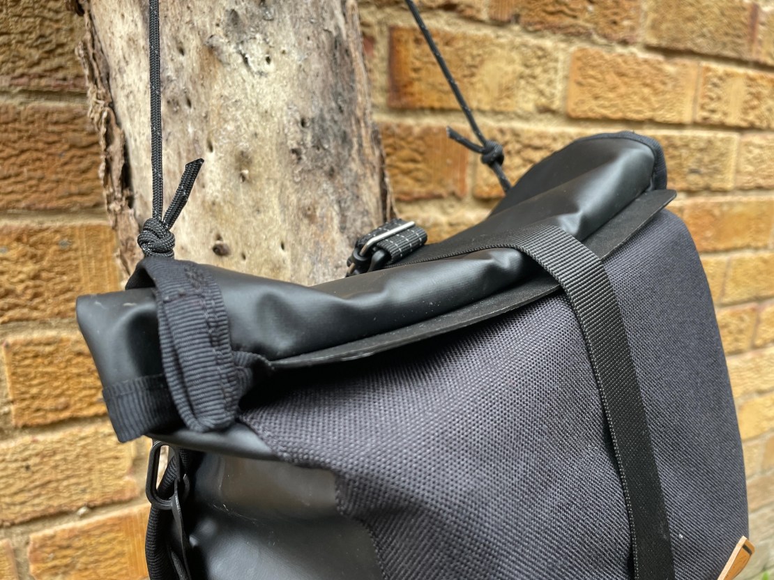 If you remove it from the bike, you can sort of use a bit more of the bag volume with it unrolled, if you deploy the para cord and wear it handbag style, dangling at your hip. However, the cord attaches fairly low, and to the rear of the bag, meaning that if your contents are a little top heavy, the bag tends to spin on the axis of the cord fastenings and turn upside down. It’s best carried – and indeed comfy to ride with – when the bag is cinched up tight and slung on your back, and the paracord pulled snug round your chest and shoulders.