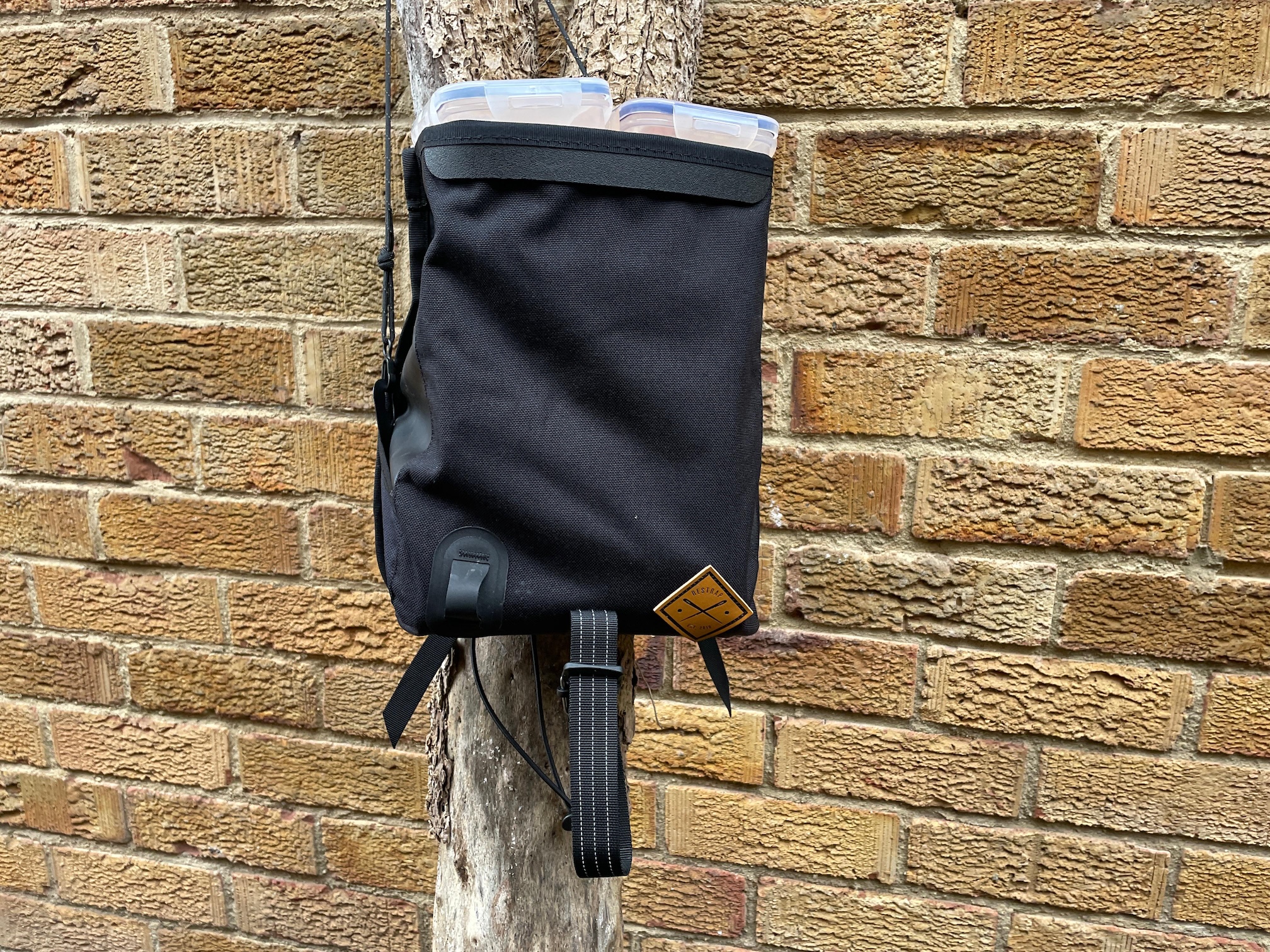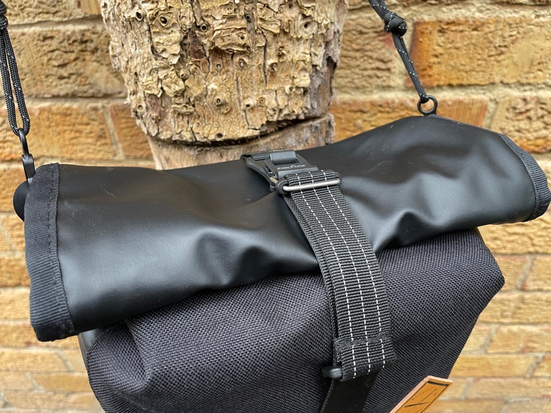 The roll top is, like every other roll top bag I have encountered, a thing of deception. If you roll it up, the wet stays out, but you’re also carrying around a few inches of false promise. All that extra fabric is just bulk and weight, not actual carrying capacity – if you have it unrolled so you can get close to the claimed 4 litres of capacity, stuff just falls out. I tested the actual capacity with some plastic kitchen containers and found that I could just get the roll top folded over (and the closure strap was at its absolute maximum extension) when there were 2×1.3 litre containers in there, though not with enough of a fold to be sure of keeping the water out. To get the kind of double roll you need to keep things waterproof, I could really only fit in 2 x 850ml containers. Yes, there was room for a little more if I’d squashed jackets etc in rather than cuboid food containers, but regardless it’s quite a way short of 4 litres, and only a little above the 1.5 litre capacity of the zipper fastened Restrap Canister Bag.