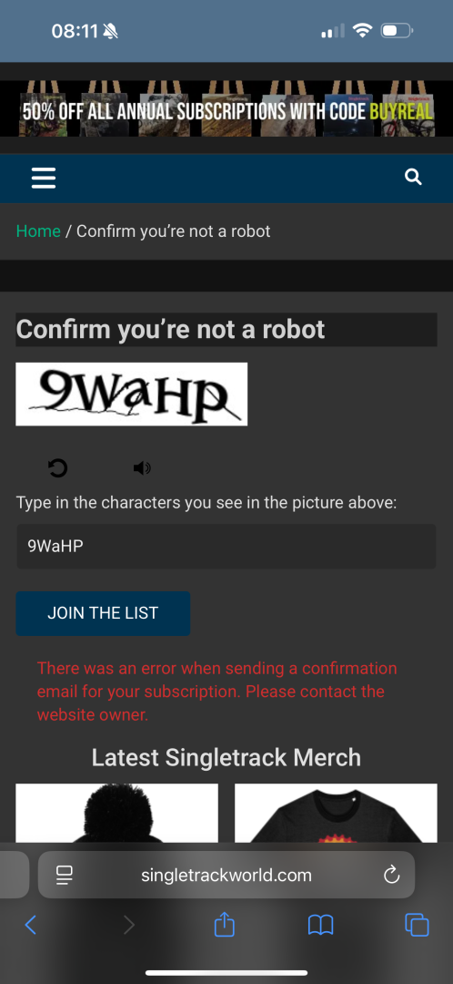 Me too. I signed up for the Newsletter & entered the anti-robot code but got the following message:
