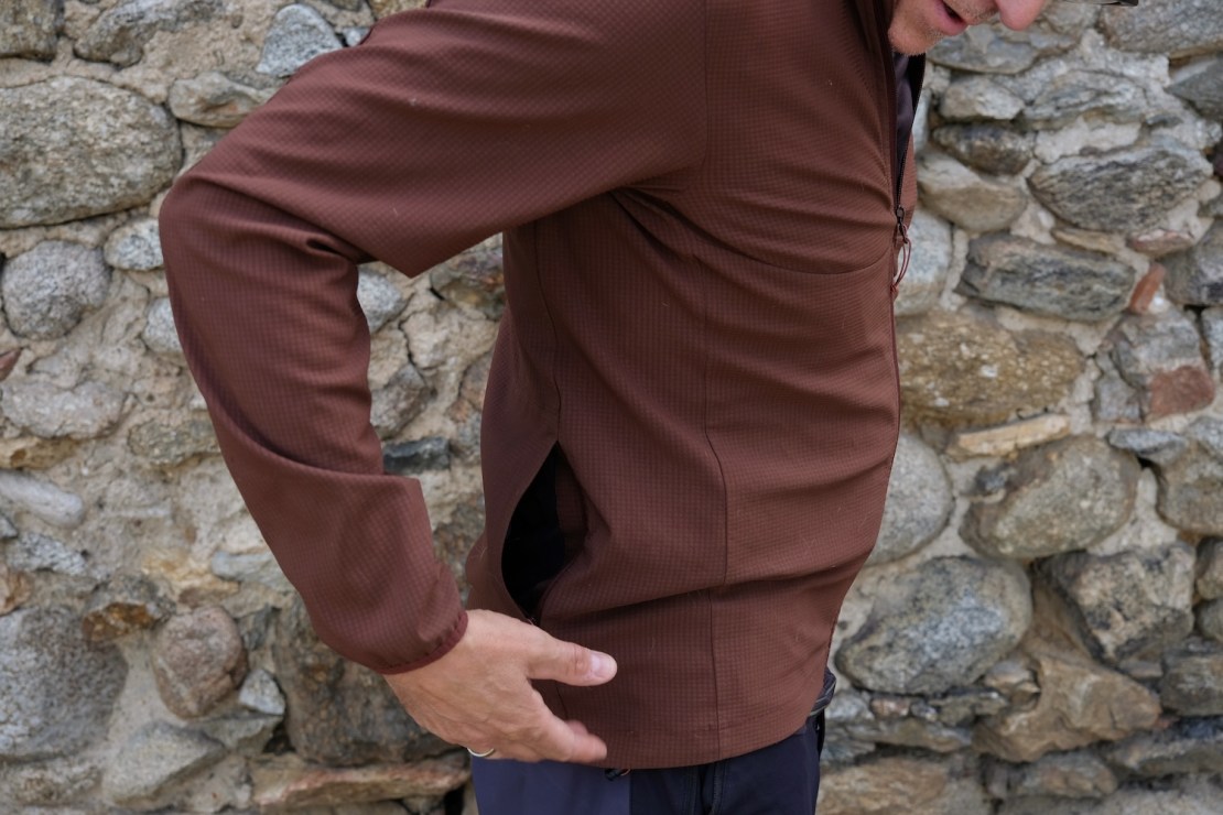Like all 7Mesh gear, it’s beautifully cut and sewn, with the (USA-sized) Medium being a great fit for my 42in chest. The arms and body fit close, but not sausage-tight and there’s a lot of stretch in the fabric. Features are limited to a single-way front zipper and an elastic waistband drawcord. There are two rear, side-entry pockets that’ll take a phone or sharing pack of Haribo. And that’s it. The cuffs are elasticated and the collar is short.