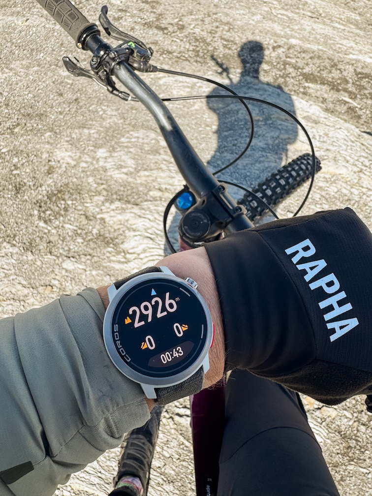 With an AMOLED screen, alongside mapping and all other functions you’d expect from a modern sports watch. It’s a remarkably capable watch that punches well above its barely noticeable weight (49g). The watch and phone app are delightfully easy to use. For a first time GPS watch user, I barely had to refer to the manual to figure it all out. The app is stripped of needless frippery – no clutter, no hearing about how many steps you didn’t take today. It’s clean, fast, and clear. Route plotting is super easy – it syncs automatically with your Strava account, you can import GPX files from elsewhere, or you can draw them in the Coros app and send them to the watch. Turn by turn navigation is good, with alerts popping up on the display if there’s a junction/turn coming up, and you are notified if you deviate too far from the plotted route. I used the watch for both running and riding, and was able to customise workout screens to suit, even mid ride/run which was a pleasant surprise. You can build the screens however you like: want your heart rate large and centre with split pace and altitude tucked underneath? No problem. Prefer one giant timer you can see mid-run? Sorted. If you like minimalism, that’s cool, but if you prefer the kitchen sink approach, that’s fine too. The silicon strap I found quite uncomfortable as it rubbed and irritated my skin at the buckle. Coros kindly sent me the alternative nylon strap, which has been significantly more comfortable (and saved 12g). I’ve only had a couple of other minor issues. When using the timer (or stopwatch), neither of the buttons lock, which sometimes leads to accidental pauses or resets. Finally, raise-to-wake could do with sharpening up. The screen is bright and clear once it’s on, but there’s a noticeable pause before it springs to life when you lift your wrist. It’s not catastrophic, but it is a little frustrating having to tap a button instead and takes away some of the overall slickness of the watch.