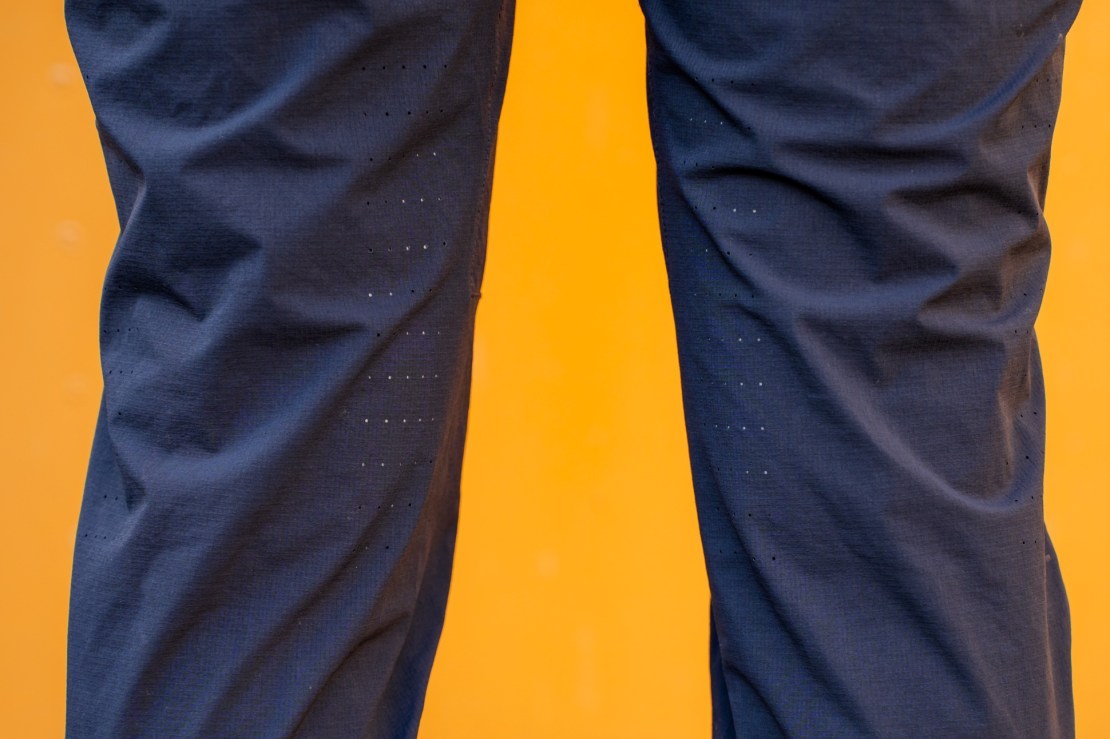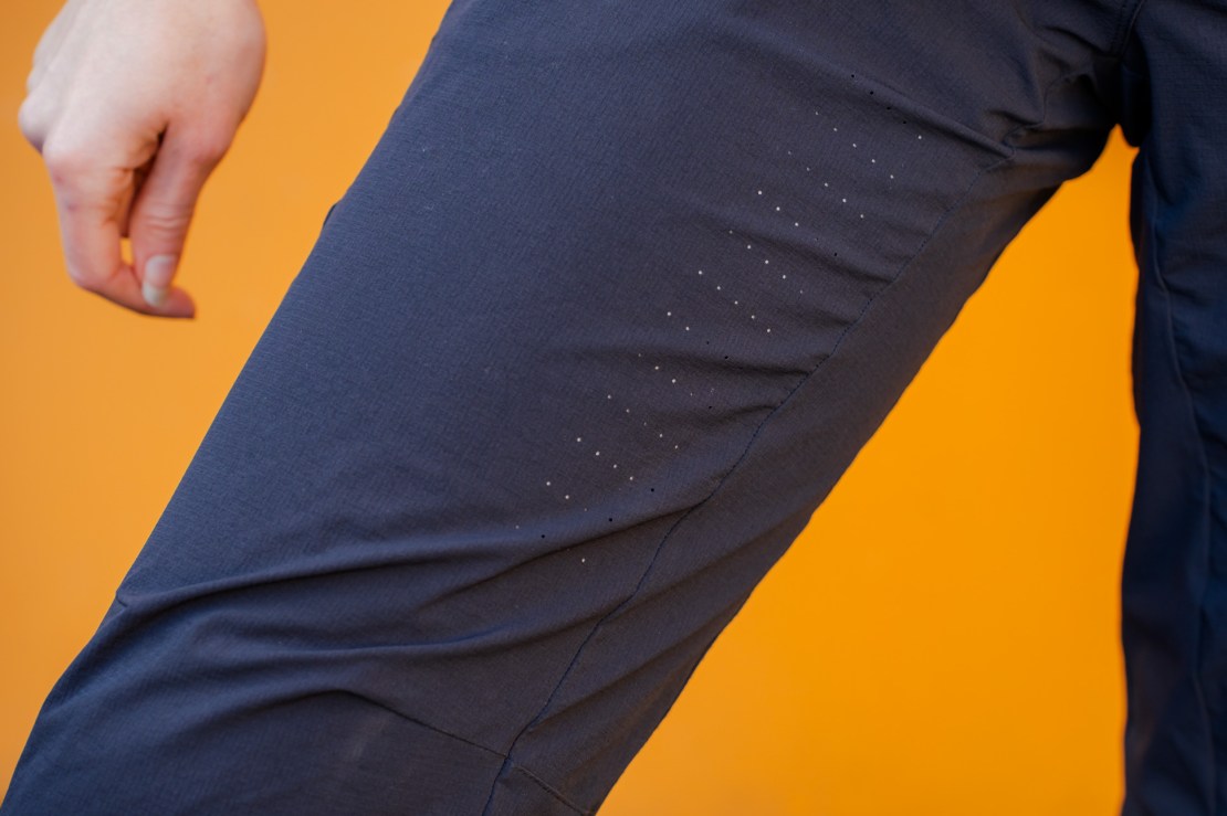 The fabric is moisture wicking and offers some protection from wet and muddy trails, but will not be enough to save you in a downpour. That said, they do dry quickly once wet. The fabric is also durable enough to withstand overgrown trails and protect you from the worst of the brambles without snagging. Although there are some ventilation perforations on the inner thighs, these trousers are on the warmer side and are best kept for autumn and winter riding.