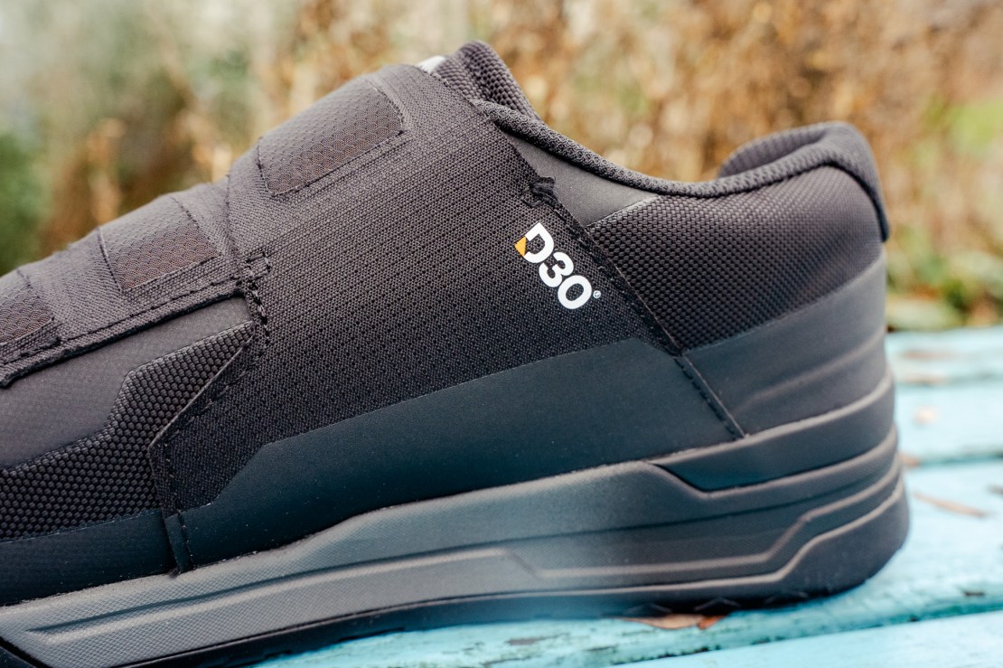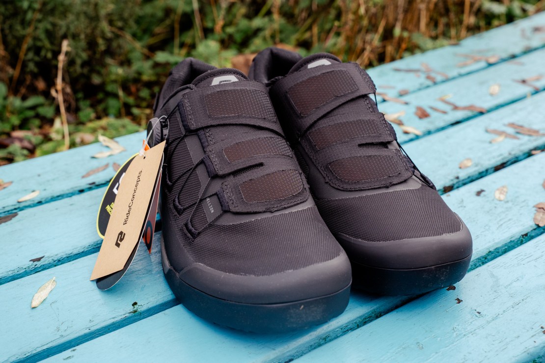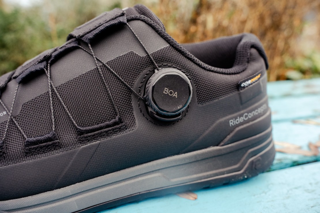 Bling BOA booties for flat pedals used to be like rocking horse product but nowadays there a fair few options. This is one of the options from Ride Concepts: the Hellion BOA (it also offers the Hellion Elite BOA with double dials). Features: MaxGrip rubber sole, D3O insole, D3O sections in the upper (for top-of-foot protection), BOA’s Li2 dial, low friction TX4 Lace, BOA dial shield bayonet for additional durability, gusseted tongue and EVA midsole.