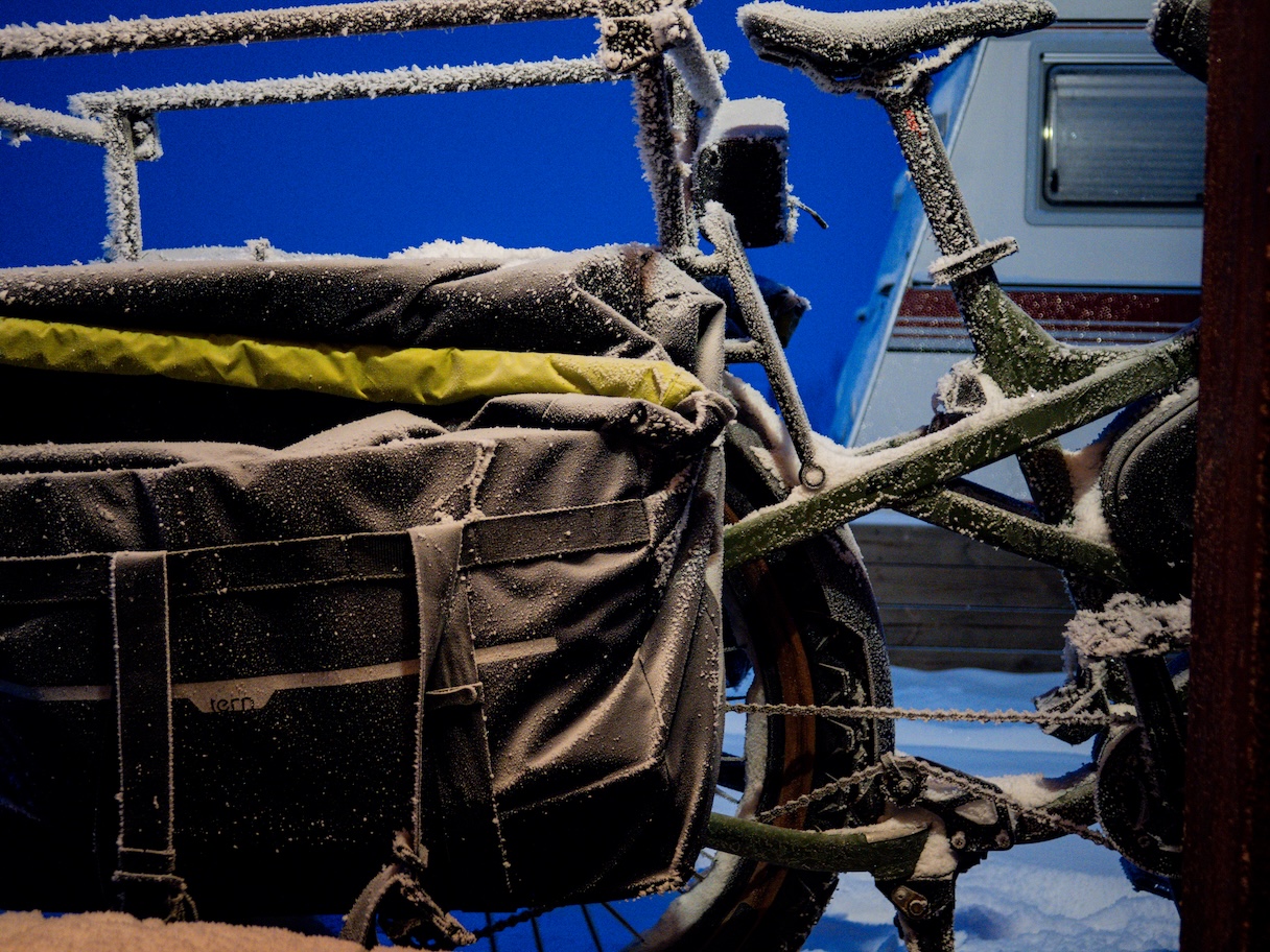 While specialised winter riding equipment comes with a hefty price tag, it lasts much longer than the riding gear I use in summer. My boots retail at around £300, the tyres are £200 each, pogies and gloves add up to £200, and the list goes on. Not to speak about the bike I ride, which retails close to £9,000 when equipped with panniers, racks and extra battery. Buying any of this for one trip would be madness, but using the investment to make this trip not a one-off, but a continued experience over the years to come, sounded much better to me. And I have the luxury of having a base in Norway in winter. Buying all the gear for the few days of snow that remain in Scotland would make me think longer about it.