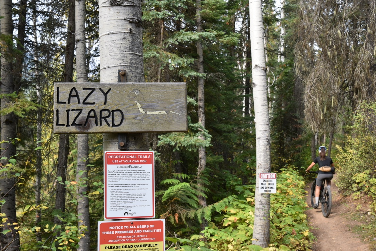 After a brief trip to the local Farmer’s Market to purchase grain free gin (Hint! More than two shots will have you feeling somewhat disconnected from your bike) after a hearty breakfast bagel, we met Alina for a gentle spin along the valley floor towards Mount Fernie. Trail 2 was to be Project 9. We had been warned by a couple of locals that the climb was a stone-cold pain in the petunias. Four pillars of pain was one comment. However, ever the optimist I tried not to let it bother me as we spun our way along broad fire road; the sunlight creating a glorious, dappled effect through the trees, the leaves on the turn for autumn’s chill embrace. Starting with Lazy Lizard, Rick’s favourite trail in the area, it was an easy start to the ascent. A small kid on a balance bike and his dad came down the trail. Clearly, they start them young here. Reaching a clearing with electricity pylons looming above, we passed what looked like a fresh bear poo. Checking my bear spray, I endeavoured to ride casually as if there was nothing to worry about. Alina was reassuring in noting that it had been a bumper summer for berries thus most bears were pretty ready for winter but having ridden the Banff river trail many years ago when a runner was mauled to death not long after, I prefered to err on the side of caution.