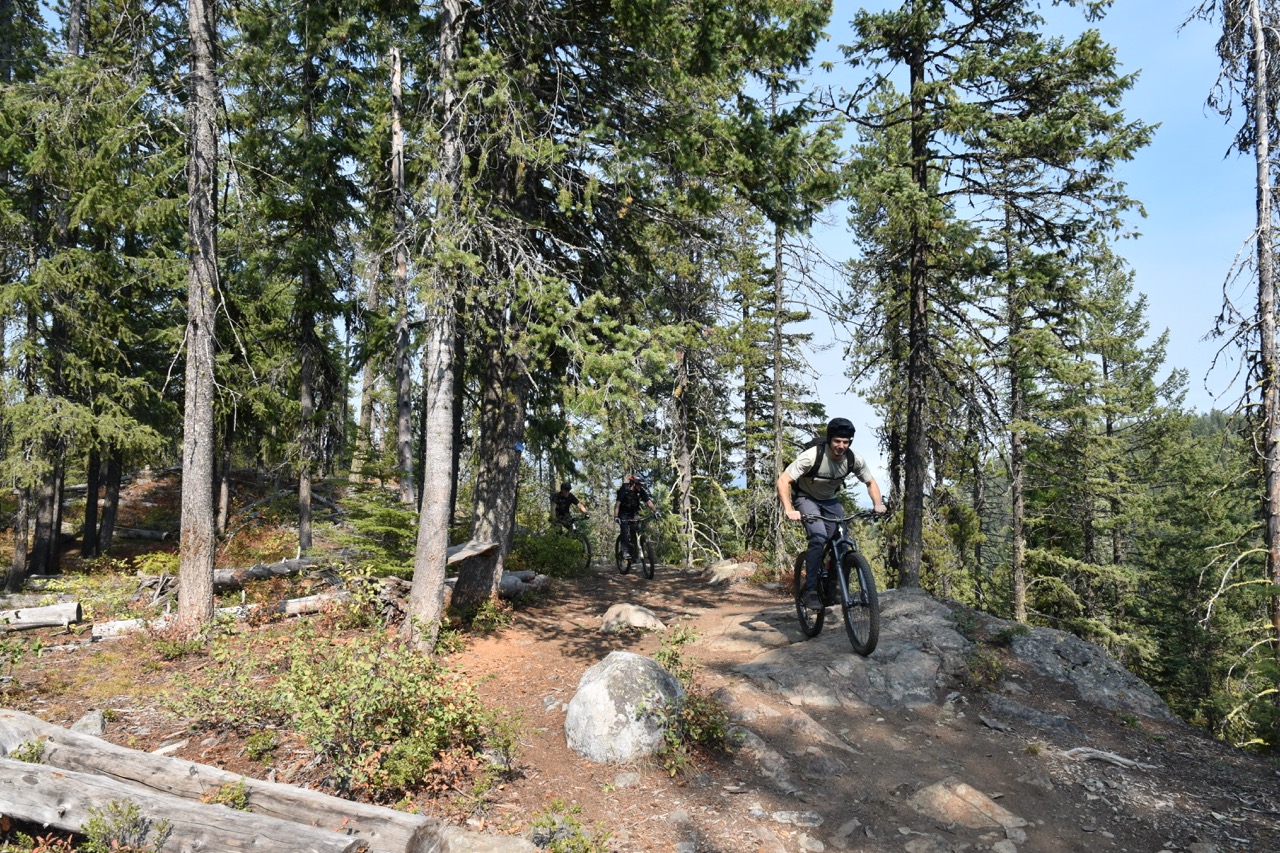 Riding through the rapidly expanding ski resort, it being in the middle of a building boom, we headed down a trail called Blue Elephant. With some nice sections of exposed rock, it felt a little more technical but still just as fun, Rounding a corner, I met two of the local trailbuilders, Mark and Sam, of the Kootenay Columbia Trails Society, who were doing a sterling job of armouring up a section of trail. Chatting with them, they were enthusiastic and a great advert for the Society. Showing me their little black book of trails they work on, they told me that they are involved in the management and maintenance of the best part of 200km of trail spread across some 74 trails. As with Fernie, the scale and ambition of the trail network blew me away. Bidding them a fond farewell, I soon caught up with the guys for the final flourish – Claim Staker. A Black Diamond trail, it features an exposed rock chute and rollable boulder that makes for a smashing introduction to the more technical trails on offer. The chute was a hoot to ride. All you need to do is just point and shoot, if you will pardon the pun. So fun was it that I felt compelled to ride it several times. Just make sure your forks have plenty of air in them – if the compression at the bottom doesn’t get you, it will on the boulder that follows soon after as I found out, much to my shoulder’s complaints.