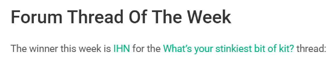 The winner this week is IHN for the What’s your stinkiest bit of kit? thread: