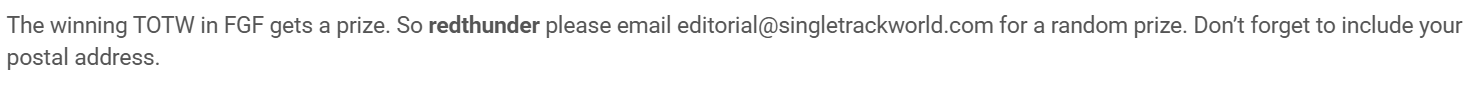 The winning TOTW in FGF gets a prize. So IHN please email editorial@singletrackworld.com for a random prize. Donโt forget to include your postal address.