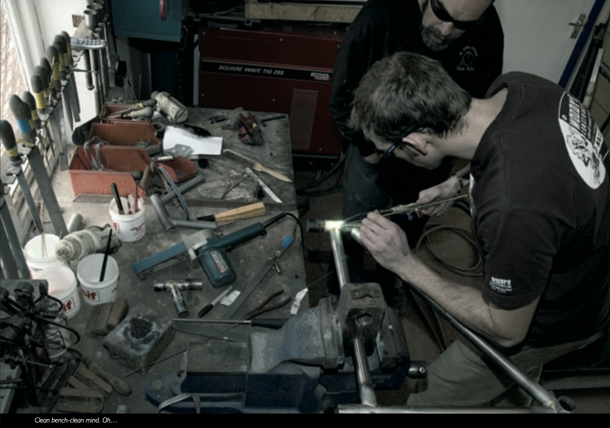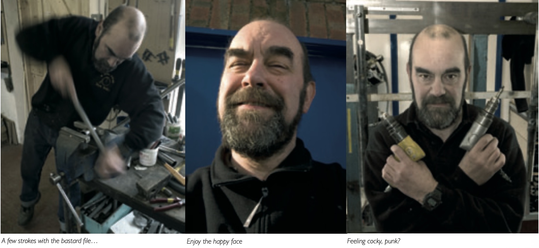 Dave’s safety brief, in a true gritty North Eastern style is straight to the point. “Assume everything’s hot. You will cut yourself. Everyone does. One bloke the other week; oh I don’t’ know what he did, but there was blood everywhere, on the tools, on the walls, he made it to the kitchen, it was all over the floor. Debbie was mad. Still, at least there was none on the frame – it makes it rust”