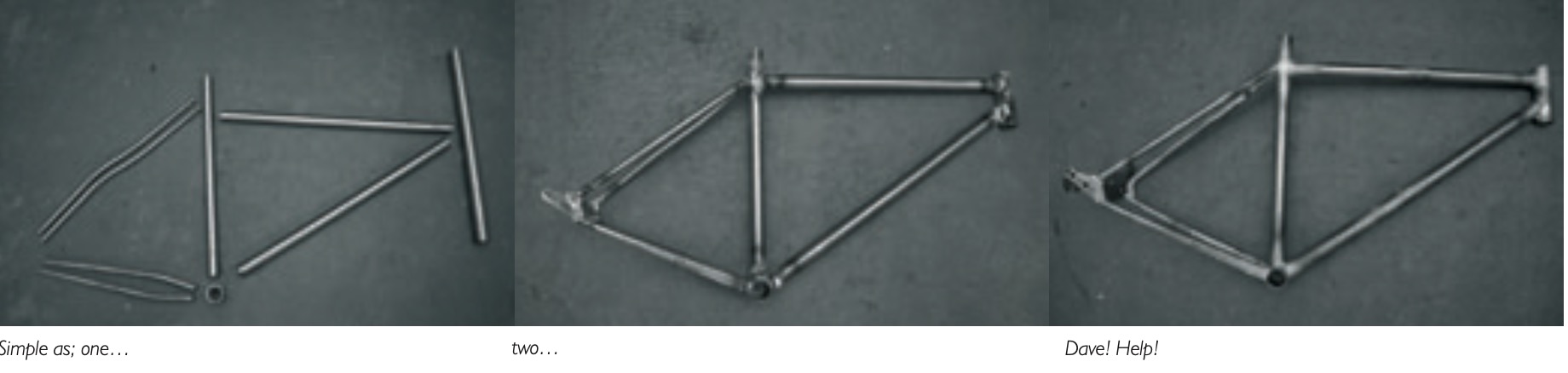 Whether you choose to make a road frame, mountain bike frame or some macabre hybrid, Dave reckons within five days you’ll be able to go home from his course with a perfectly serviceable frame. And possibly a pair of forks. The secret to making Dave’s course so accessible is his custom made jig. His current one is the ‘Mark Three’. This is to be used in conjunction with your own ‘Mark One Eyeball’.