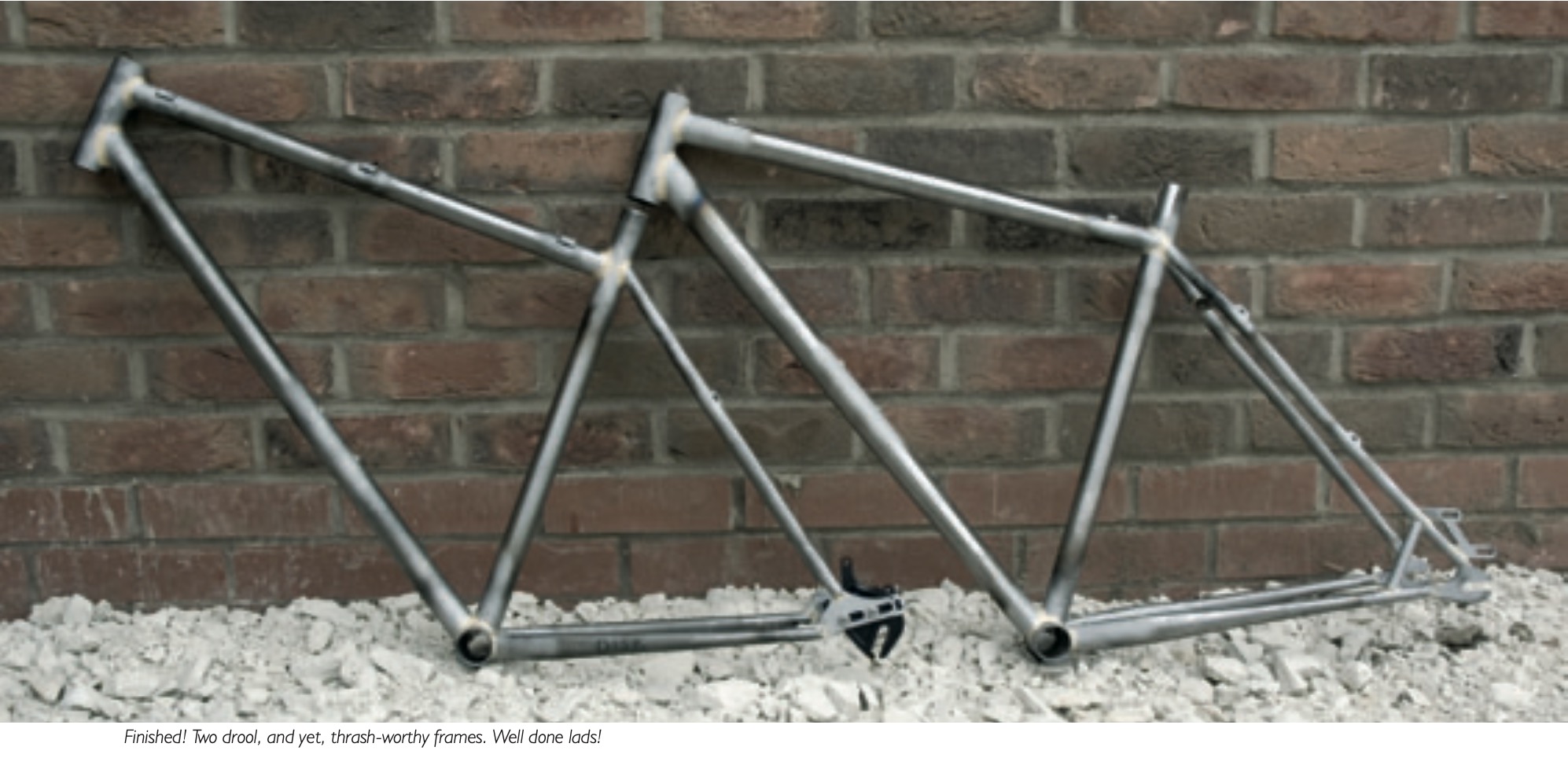 I carry on finishing off my frame with stay bridges and tube sealing. The finished frame is shot blasted by Dave and hey presto! I have my frame. Apparently to date every frame built on his courses has been radically different. Road frame with gears, singlespeed road frame, fixed road frame, Audax, some others I can’t remember and now ours. A Rohloff- friendly 26er and a singlespeed 29er. The first mountain bikes to be made on Dave’s course.