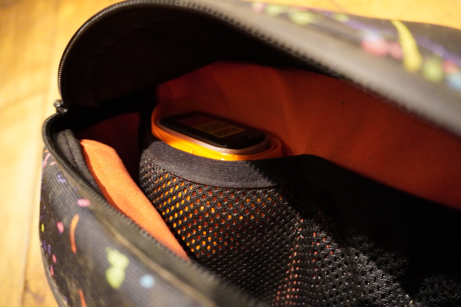 Inside the main pocket there are two mesh-like pockets for securing gear. I store a little electric pump and a very small (Tubolito) inner tube in one, with a multitool and a snack in the other. I now no longer have pumps and multitools rattling about off each other in my bag.