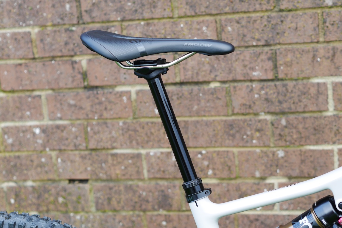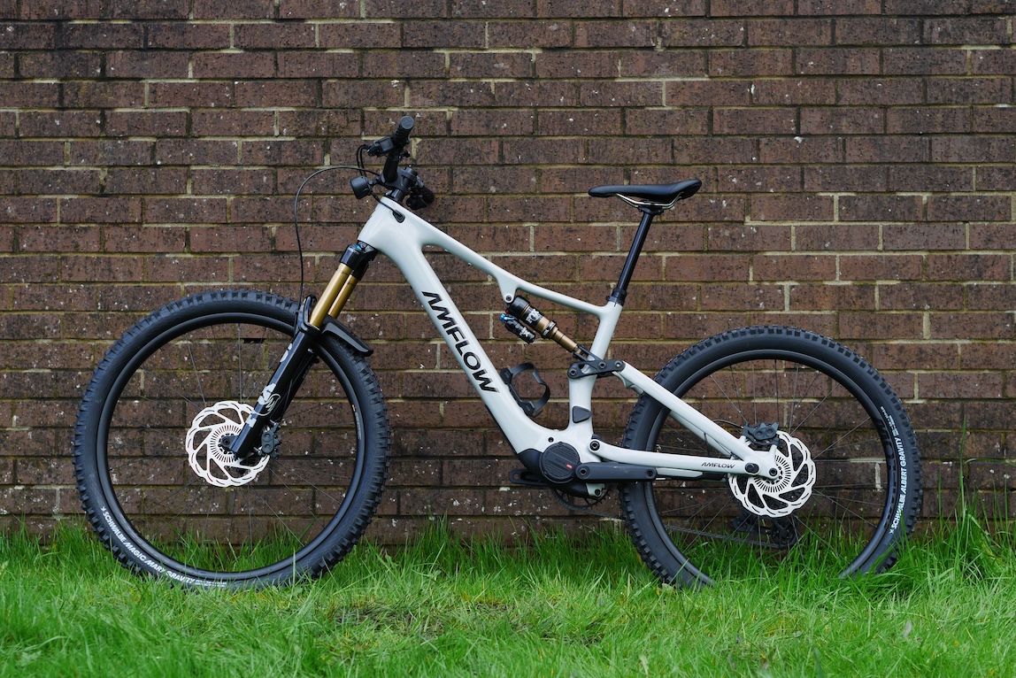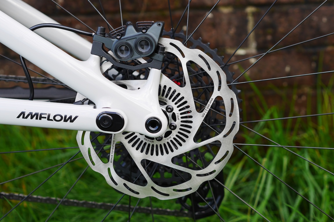 Which brings us to the specification. I can’t remember a bike with a better chosen spec than this one. Even the cockpit is great (35mm stem, 40mm rise bars, actually nice grips). The Magura Gustav Pro brakes are excellent. The Schwalbe Radial tyres are fabulous. Amflow’s own carbon wheels are something of an unknown in terms of reliability but so far, so fast. And I get on well with the Fox 36 and Float X suspension combo. Amflow’s own saddle was fine. The one and only thing I would change is the dropper and that’s because I could fit a 210mm travel dropper in there (instead of the 190mm supplied).