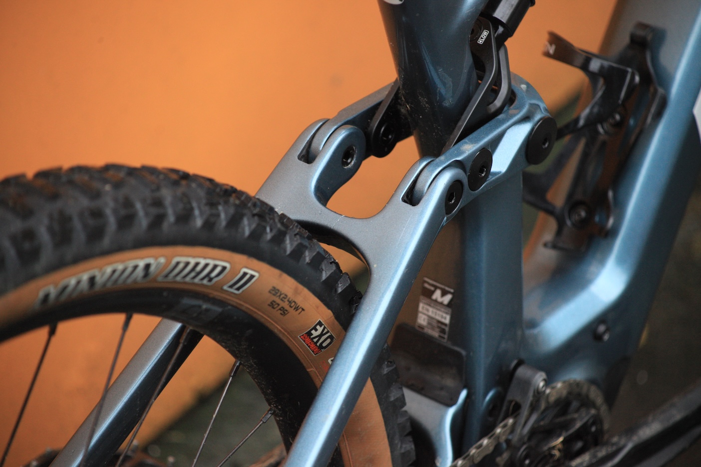 The cables do unfortunately go through the headset. The frame also seemingly collects grot in irritating places. On the seat stay linkage there are gaps around the links that don’t go all the way through, meaning you get a nice pocket for little bits of mud and grit to collect.