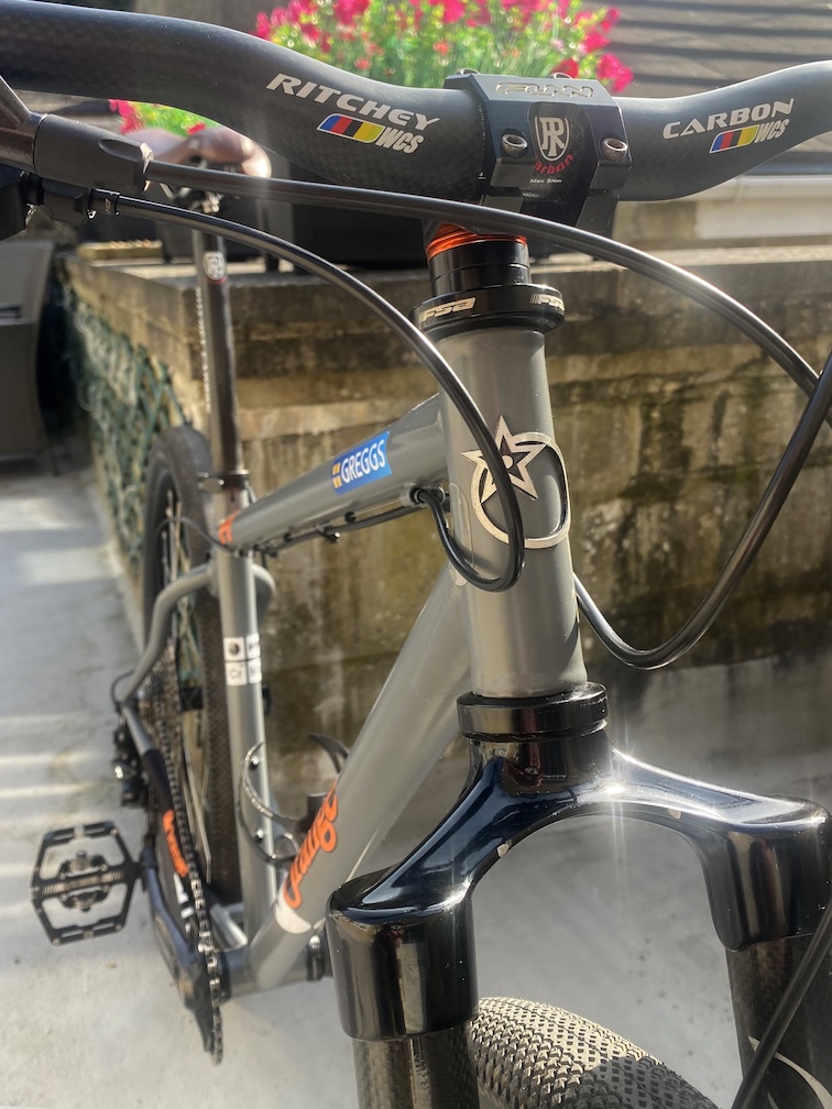So then I did the typical bloke thing (we’ve all been there) and got completely carried away. It became ‘a project’ after a mate (hi Rob!) said “you’d get a pair of 27.5” wheels in that frame. You could too, so a pair was duly purchased. Then the leaky Magura forks came off, to be replaced by Exotic rigid carbons. A new, more modern drivetrain was next, and while it was going on a diet some nice Ritchey carbon bars and a carbon seatpost to replace the saggy dropper.