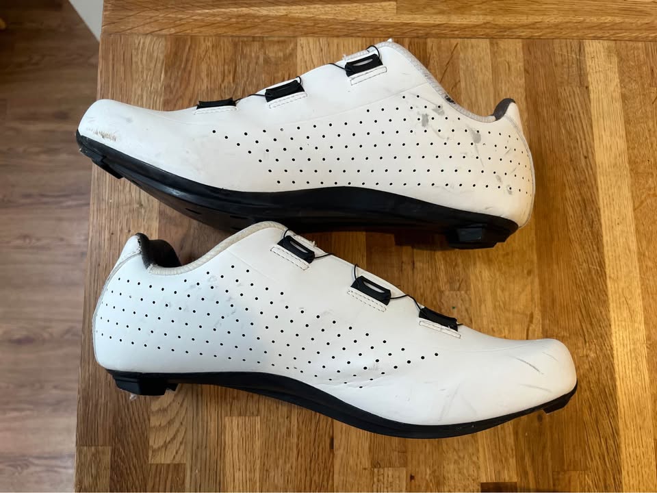 Carnac Baroudeur Road Shoes – size 45 – Nice shoes, carbon soles, only used on the turbo, few marks from chain but look worse in the pics that real life. Three bolt cleats – can include some shimano yellow ones if needed – £30